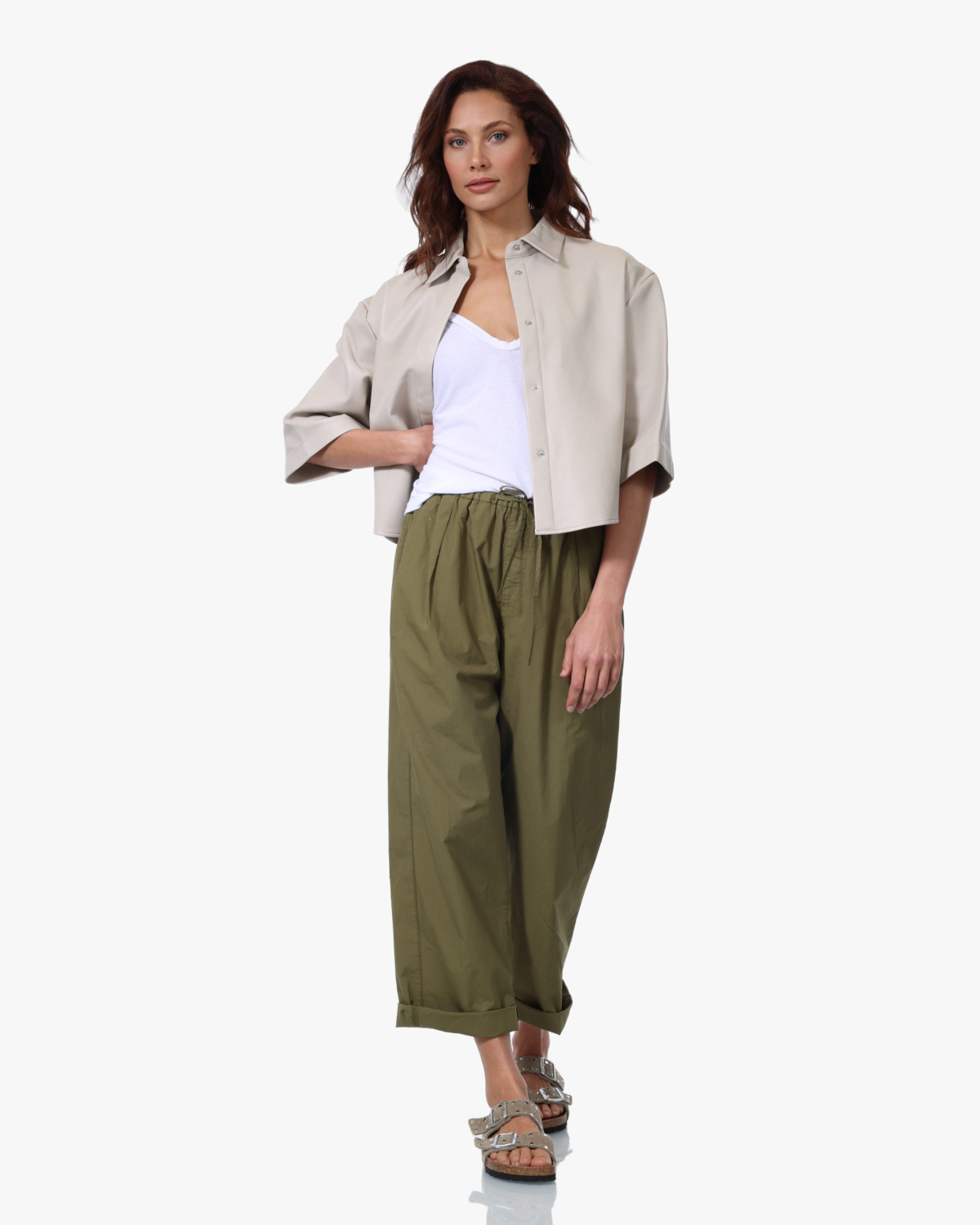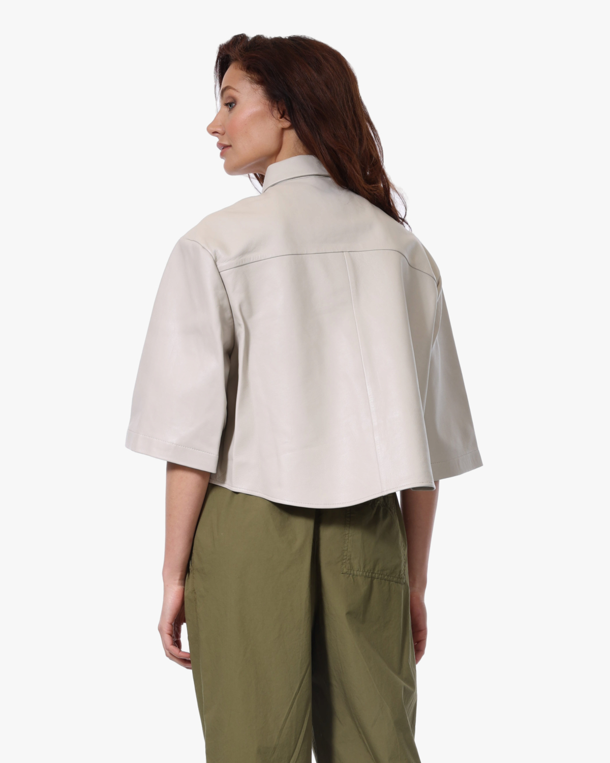Combineer deze leren blouse met een witte basic top eronder en wide-leg broeken voor een casual-chique look. Ook mooi over een midi-jurk als lichte laag tijdens de overgangsperiodes.