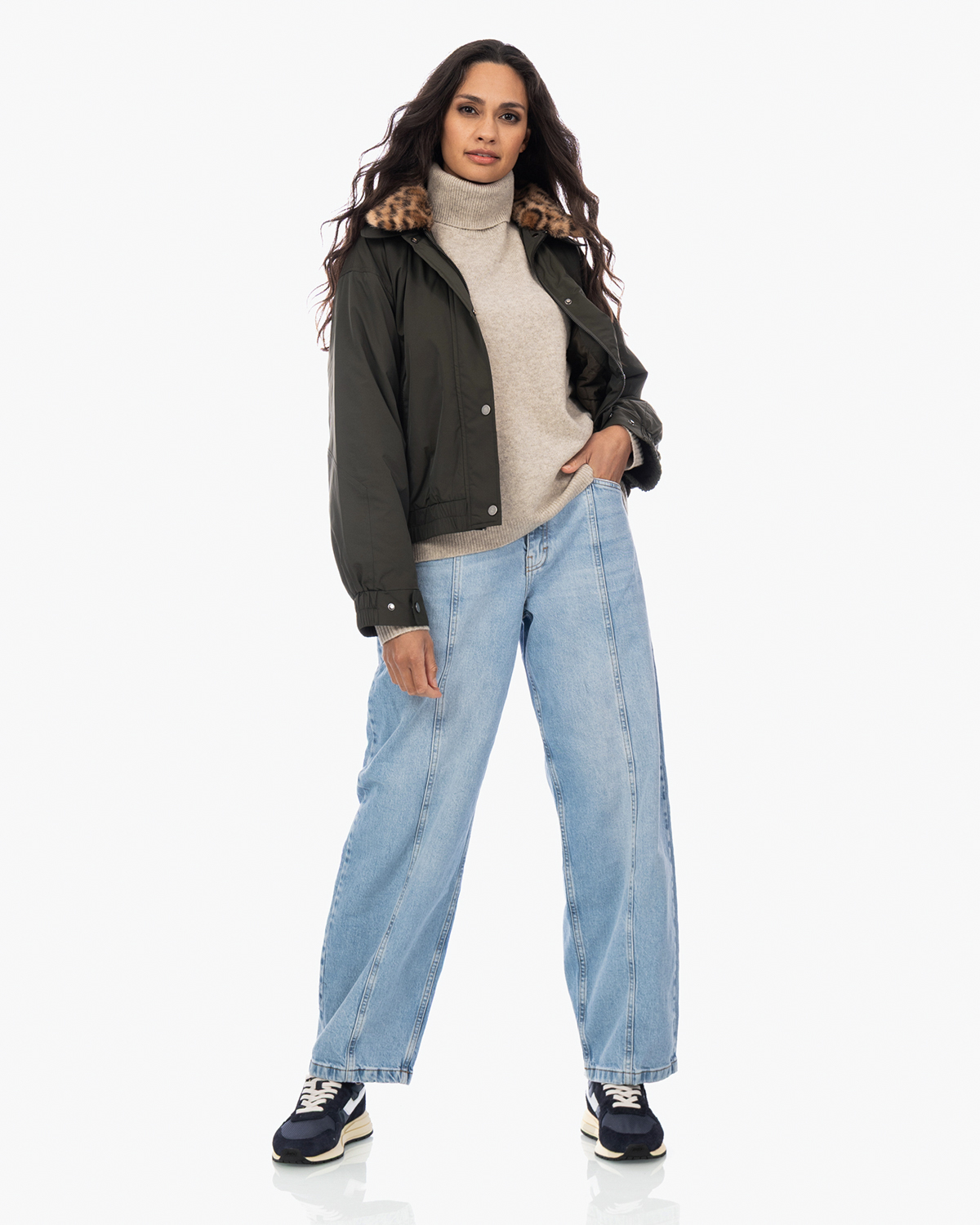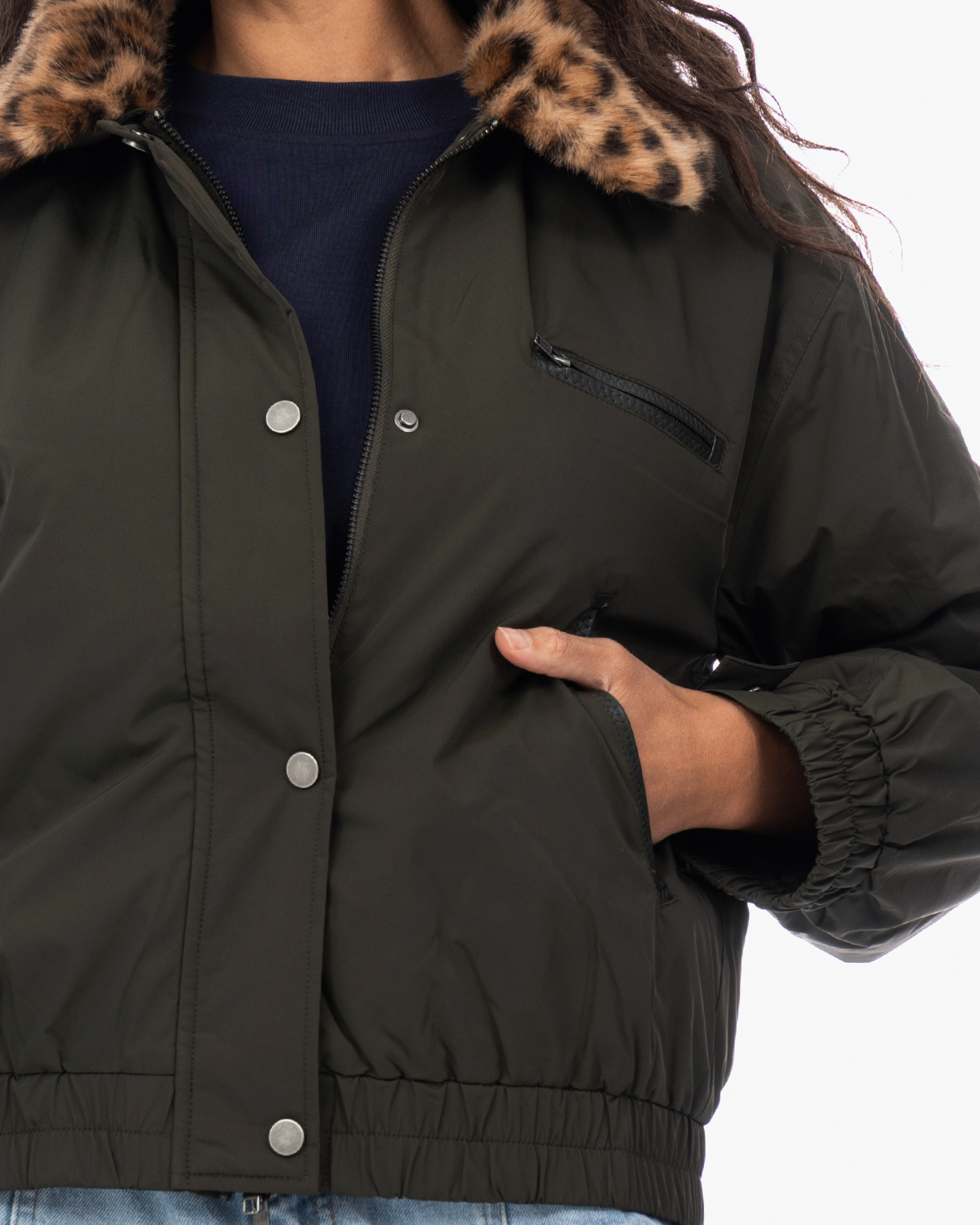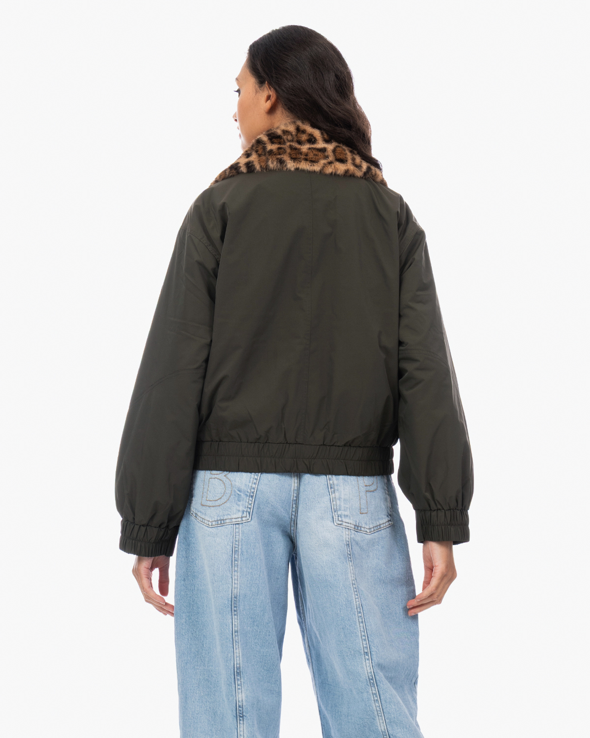 Combineer deze statement bomberjas met een eenvoudige coltrui en straight-leg jeans voor een casual look. Ook heerlijk over een basic zwarte jurk met laarzen voor een stoere twist. De neutrale groentint past goed bij aardse kleuren zoals beige, camel en natuurlijk zwart.