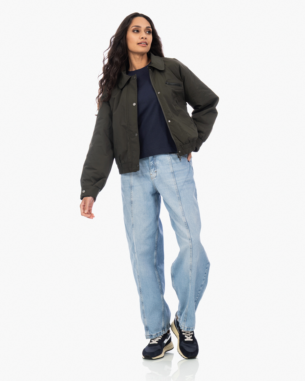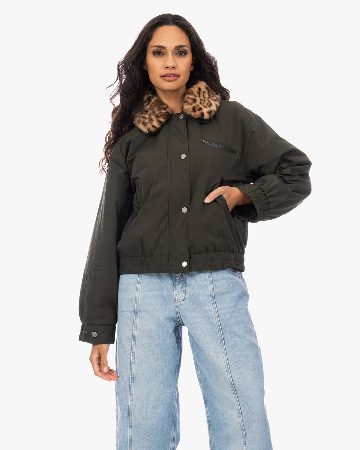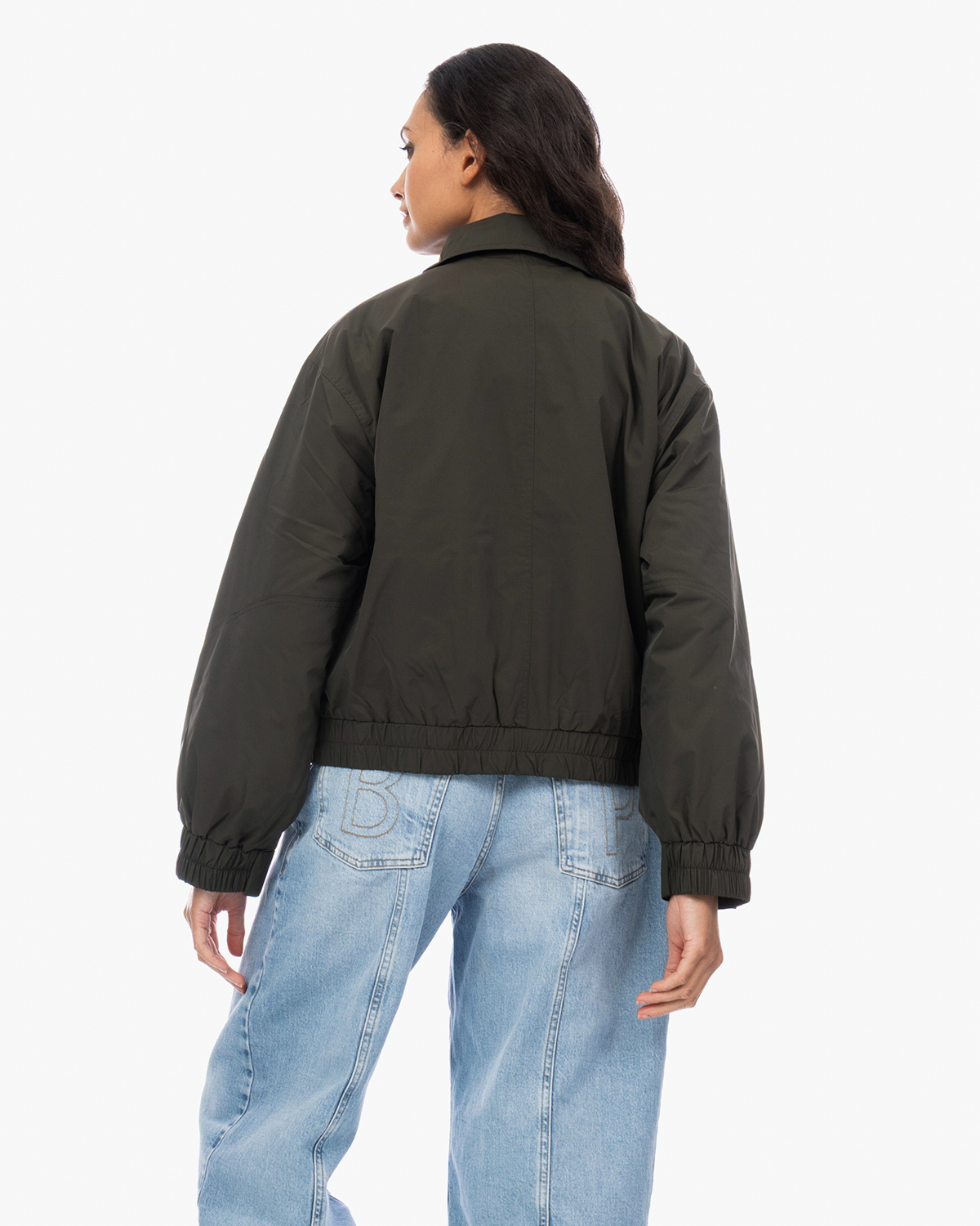 Combineer deze statement bomberjas met een eenvoudige coltrui en straight-leg jeans voor een casual look. Ook heerlijk over een basic zwarte jurk met laarzen voor een stoere twist. De neutrale groentint past goed bij aardse kleuren zoals beige, camel en natuurlijk zwart.