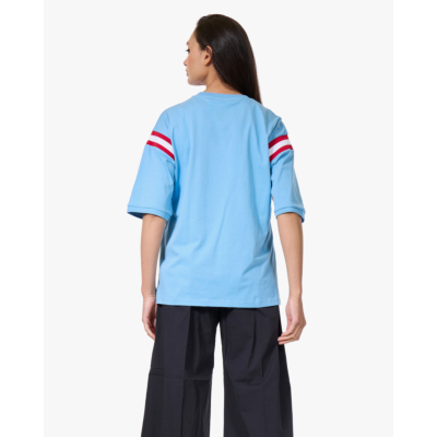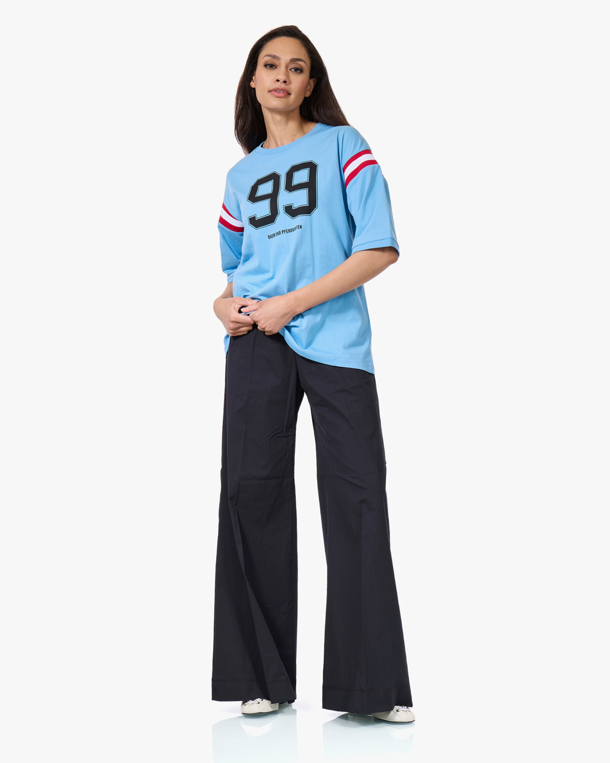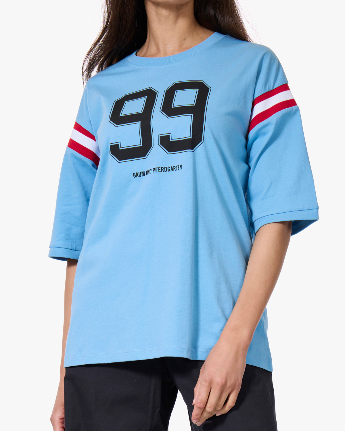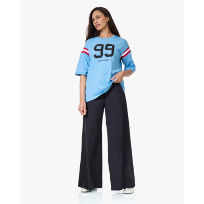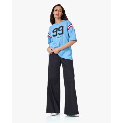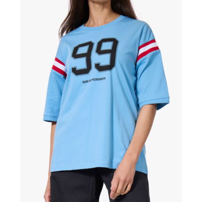 Dit collegiate T-shirt van Baum und Pferdgarten heeft een relaxed fit en korte mouwen. De blauwe katoenen top is voorzien van een opvallende 99-print op de voorzijde en contrasterende rood-witte strepen op beide mouwen. Het katoenen materiaal voelt zacht aan en draagt comfortabel. De ronde hals en oversized pasvorm geven het shirt een casual, sportieve uitstraling die perfect past bij de huidige trend van college-inspired fashion.