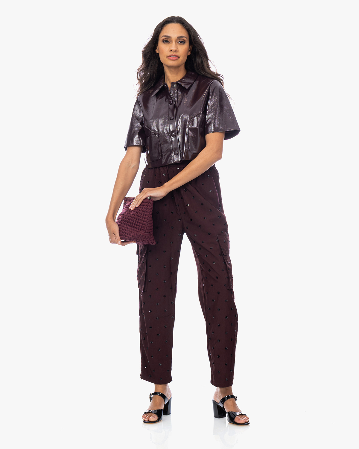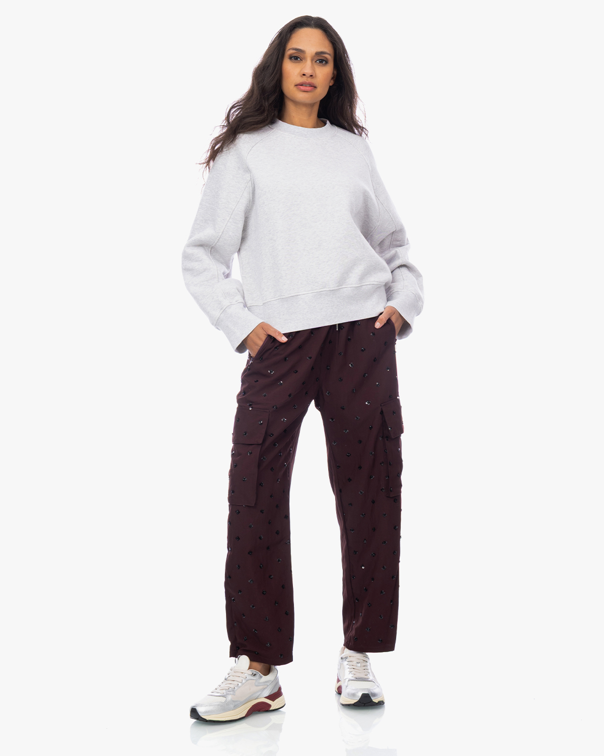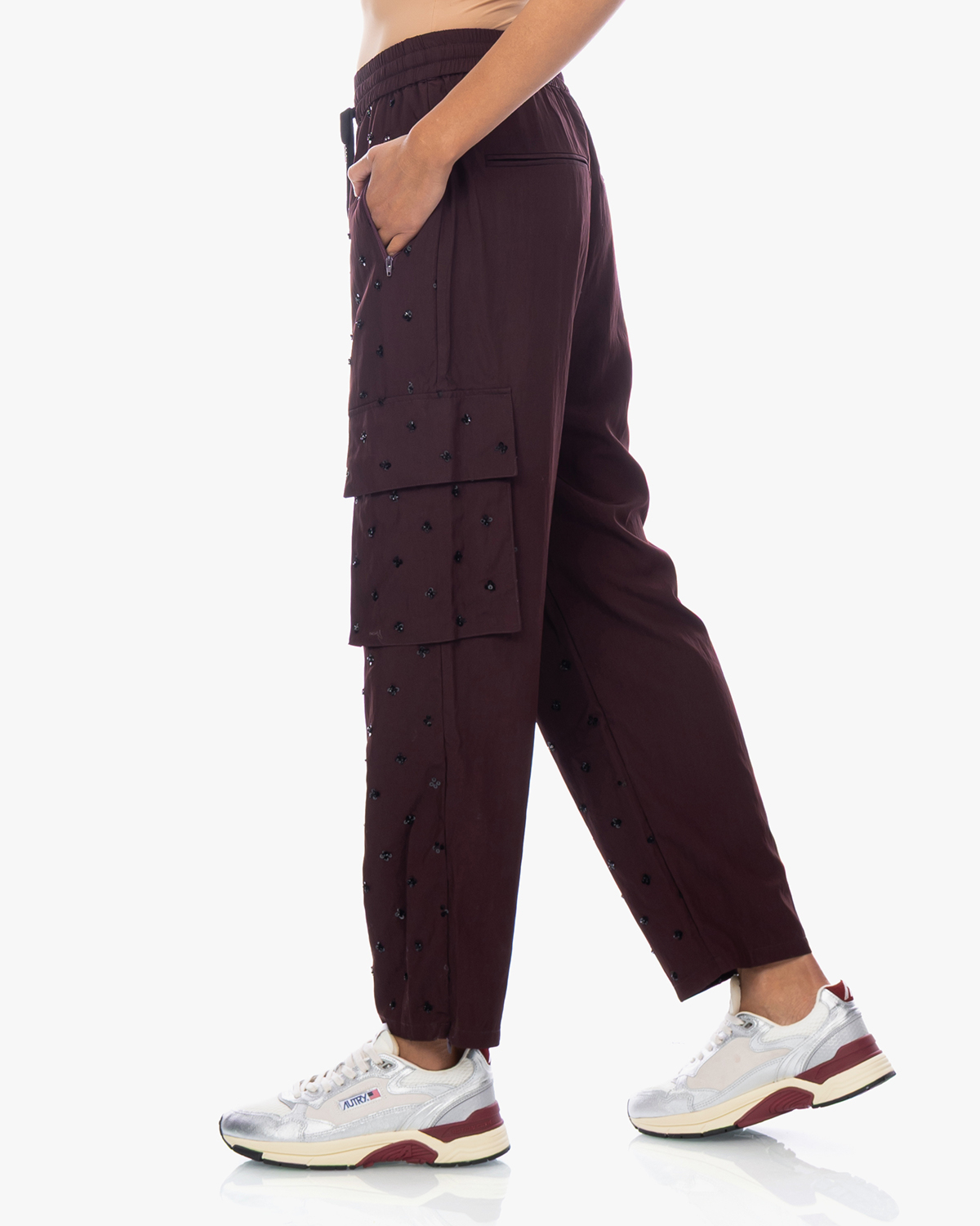 Deze bordeauxrode cargobroek van Baum und Pferdgarten combineert stoer met speels door de pailletten die verspreid over de stof glinsteren. De broek is gemaakt van een comfortabele mix van 67% viscose en 33% polyamide en heeft een relaxed fit met elastische taille en trekkoord. Praktische cargozakken aan de zijkanten geven het kledingstuk zijn karakteristieke uitstraling. De rechte pijpen en enkellange snit maken het een eigentijdse favoriet.