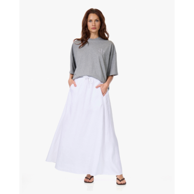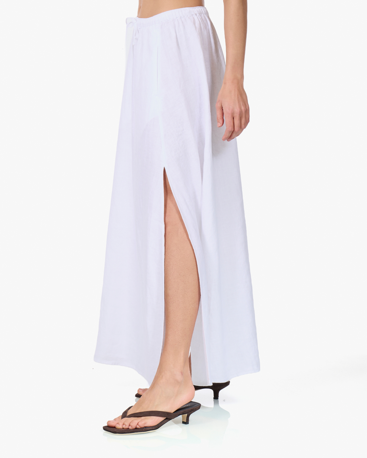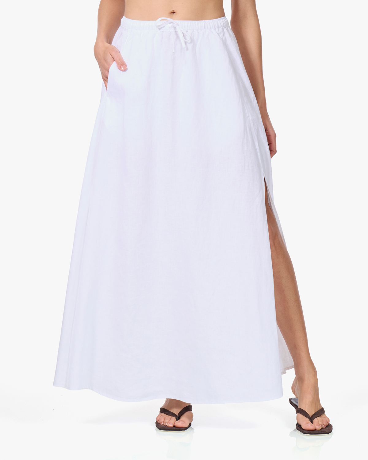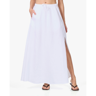 Deze witte maxi rok van 100% linnen heeft een relaxed fit pasvorm die heerlijk draagt op warme dagen. Het natuurlijke linnen voelt luchtig aan en ademt goed. De rok heeft een elastische tailleband met trekkoord voor een comfortabele passing en steekzakken aan de zijkanten. Het klassieke A-lijn silhouet valt elegant tot aan de enkels en heeft een splitdetail aan de zijkant voor bewegingsvrijheid.