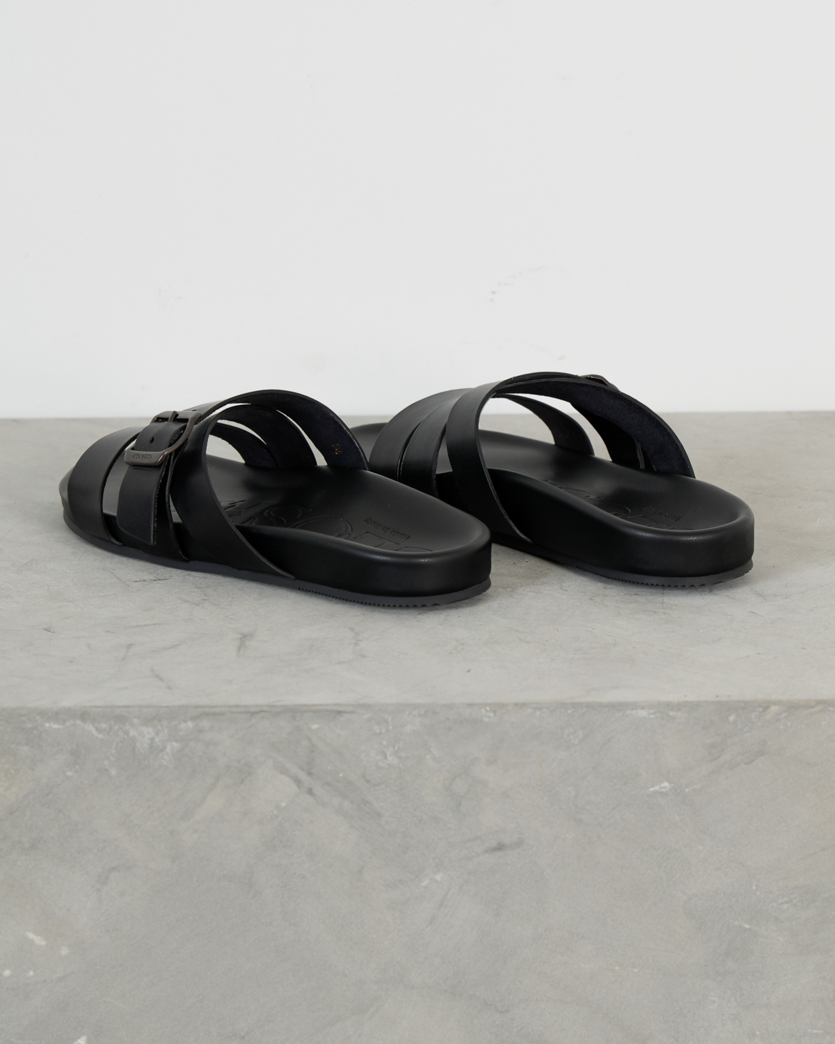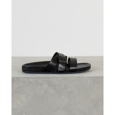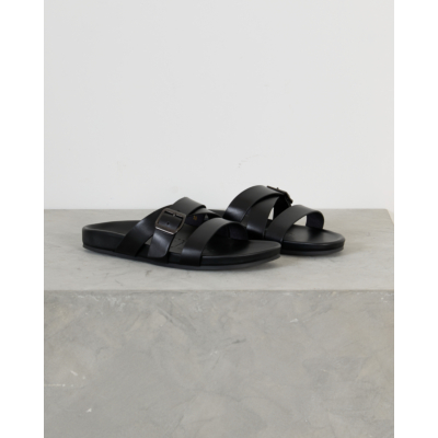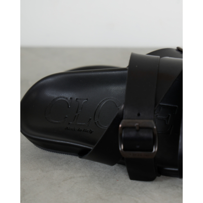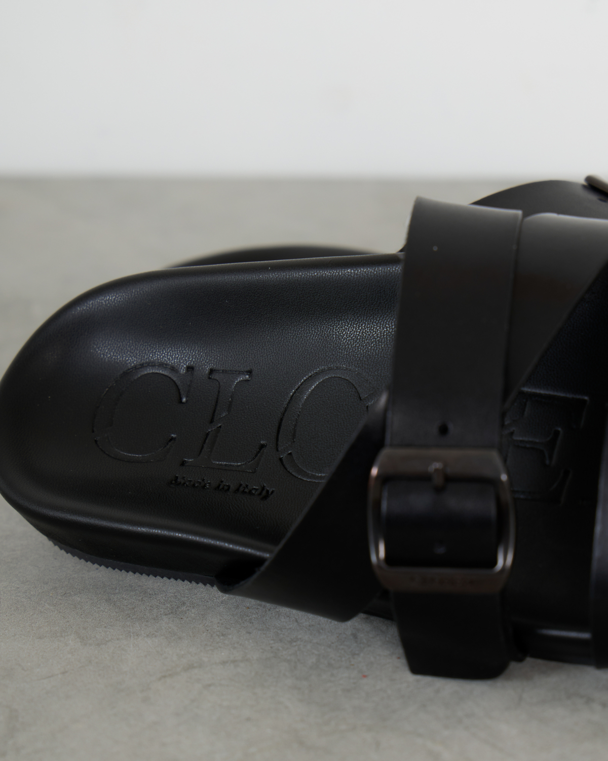 Deze zwarte leren slippers van Closed zijn gemaakt van hoogwaardig zwart leer met een minimalistische uitstraling. Het design kenmerkt zich door twee brede bandjes over de voet, waarvan één voorzien is van een verstelbare gesp met metalen sluiting. De sandalen hebben een platte zool en een comfortabele voetbedding voor dagelijks draagcomfort. Het Closed logo is subtiel gegraveerd in de binnenzool.