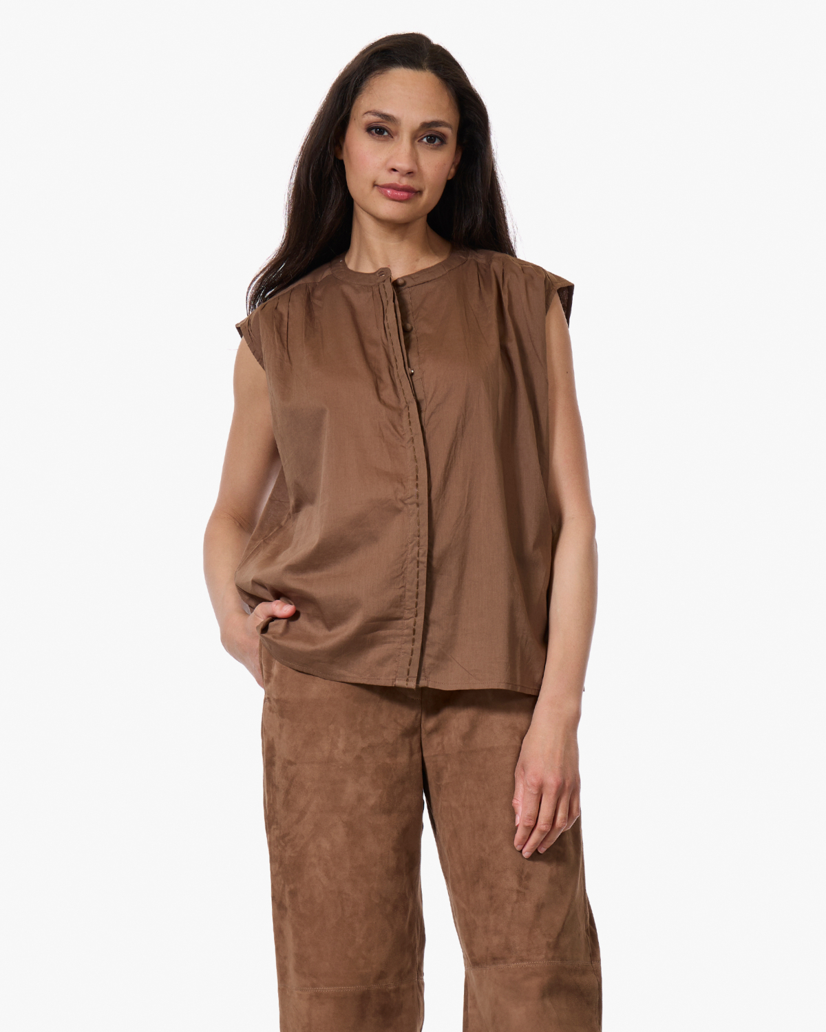 Deze mouwloze blouse in een warme bruintintint is gemaakt van 100% katoen en heeft een relaxed fit silhouet. De ronde halslijn en doorlopende knoopsluiting aan de voorkant geven een klassiek karakter, terwijl de gevouwen schoudernaden een moderne twist toevoegen. Het zachte katoen voelt comfortabel aan en de losse pasvorm zorgt voor bewegingsvrijheid tijdens drukke dagen.