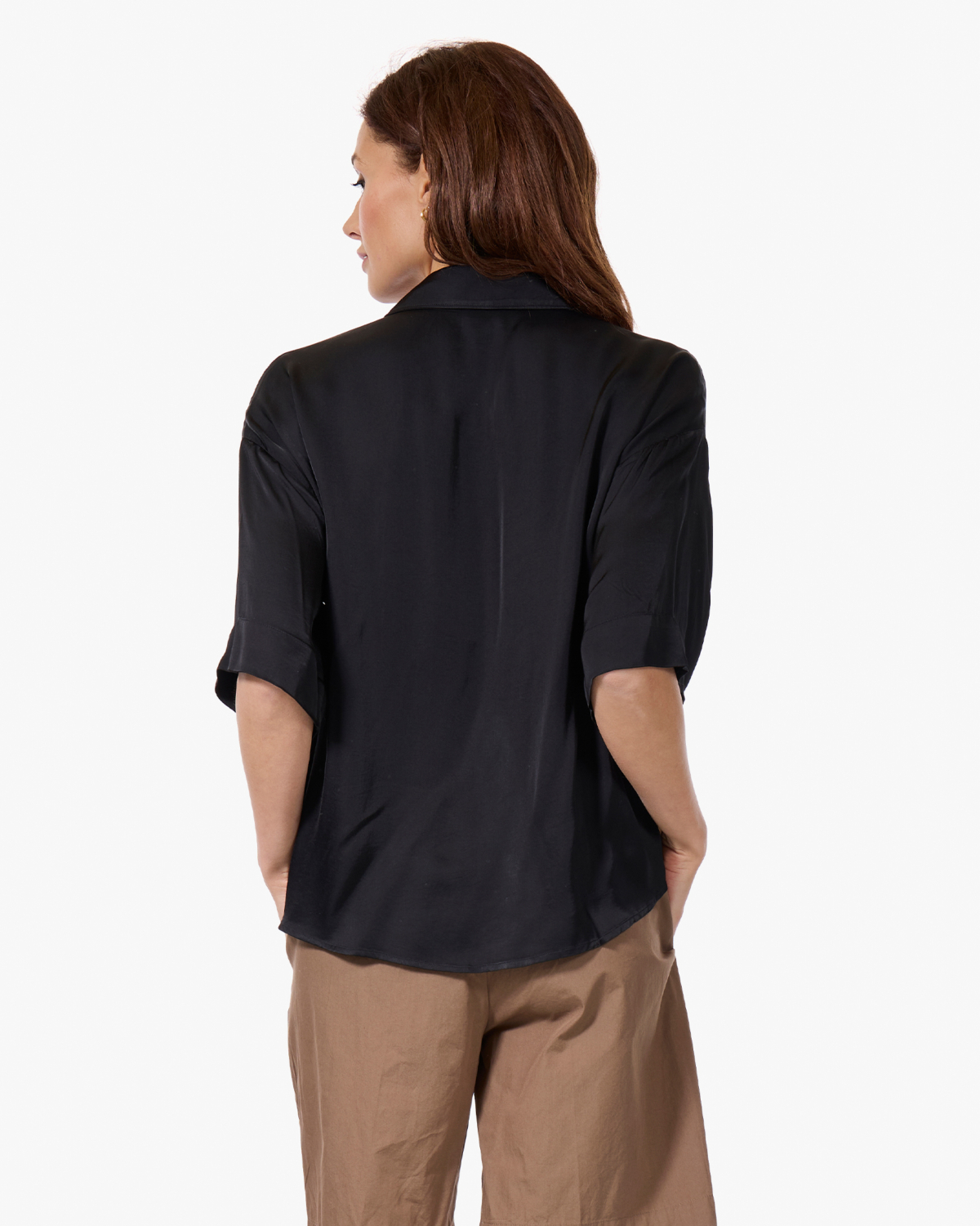 Deze zwarte blouse van Diega heeft een elegante V-hals en korte mouwen die tot halverwege de elleboog reiken. Het zachte viscose materiaal valt soepel en biedt een relaxed fit die heerlijk comfortabel draagt. De blouse heeft een tijdloze uitstraling met subtiele kraagdetails die de look afmaken.