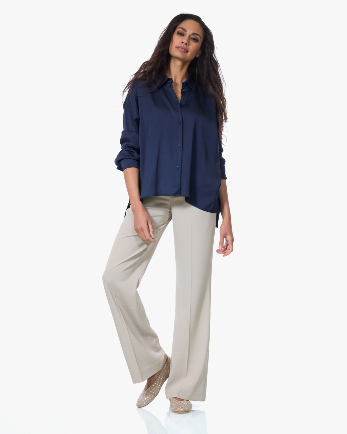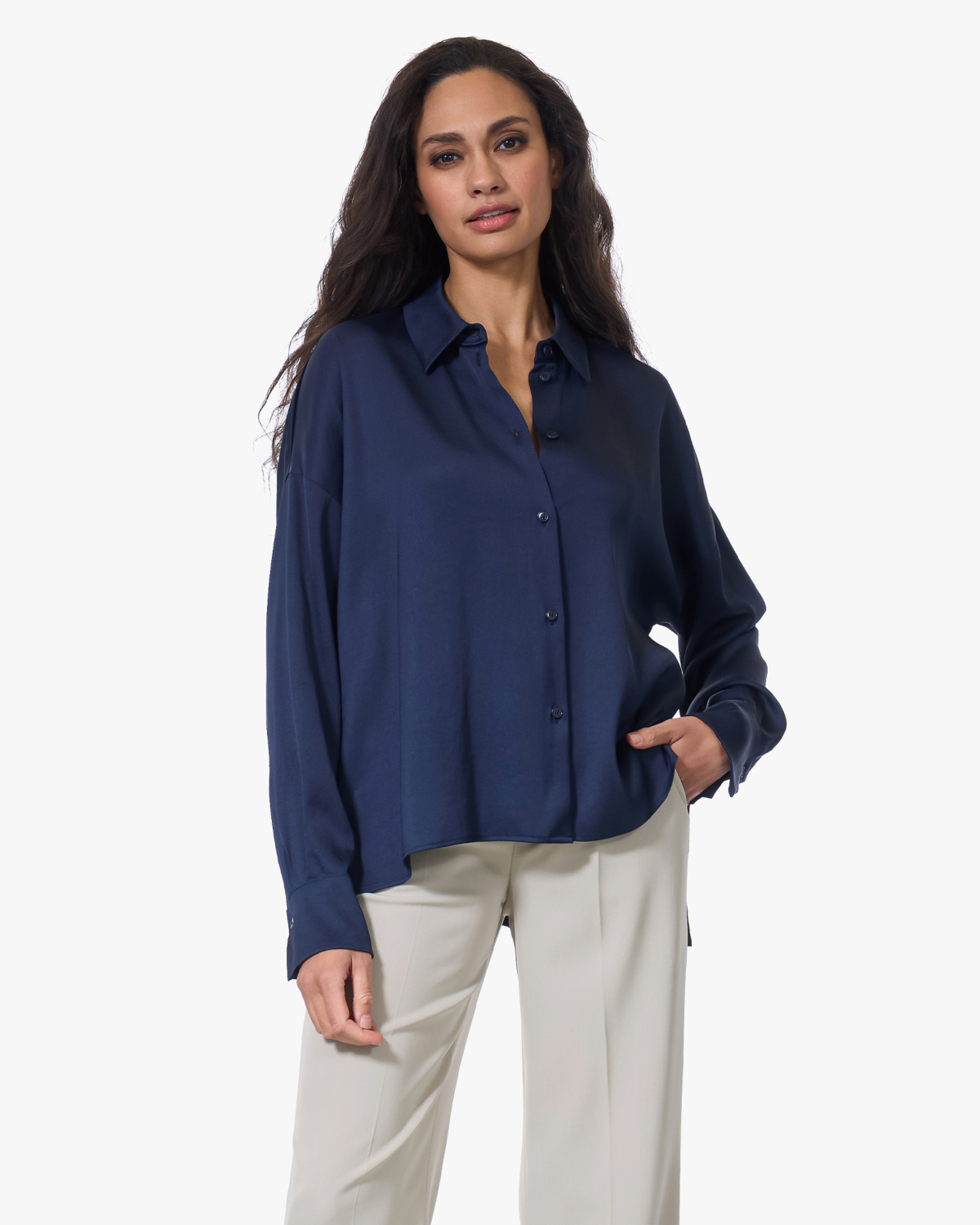 Deze tijdloze blouse in marineblauwe satijn van Drykorn combineert elegantie met draagcomfort. De klassieke kraag en knoopsluiting aan de voorzijde geven het shirt een verfijnde uitstraling. Met lange mouwen en manchetten met knoopjes biedt de blouse een regular fit die soepel om je lichaam valt. Het satijnen materiaal (96% acetaat, 4% elastaan) voelt zacht aan en heeft een subtiele glans die het ontwerp een luxe finish geeft.