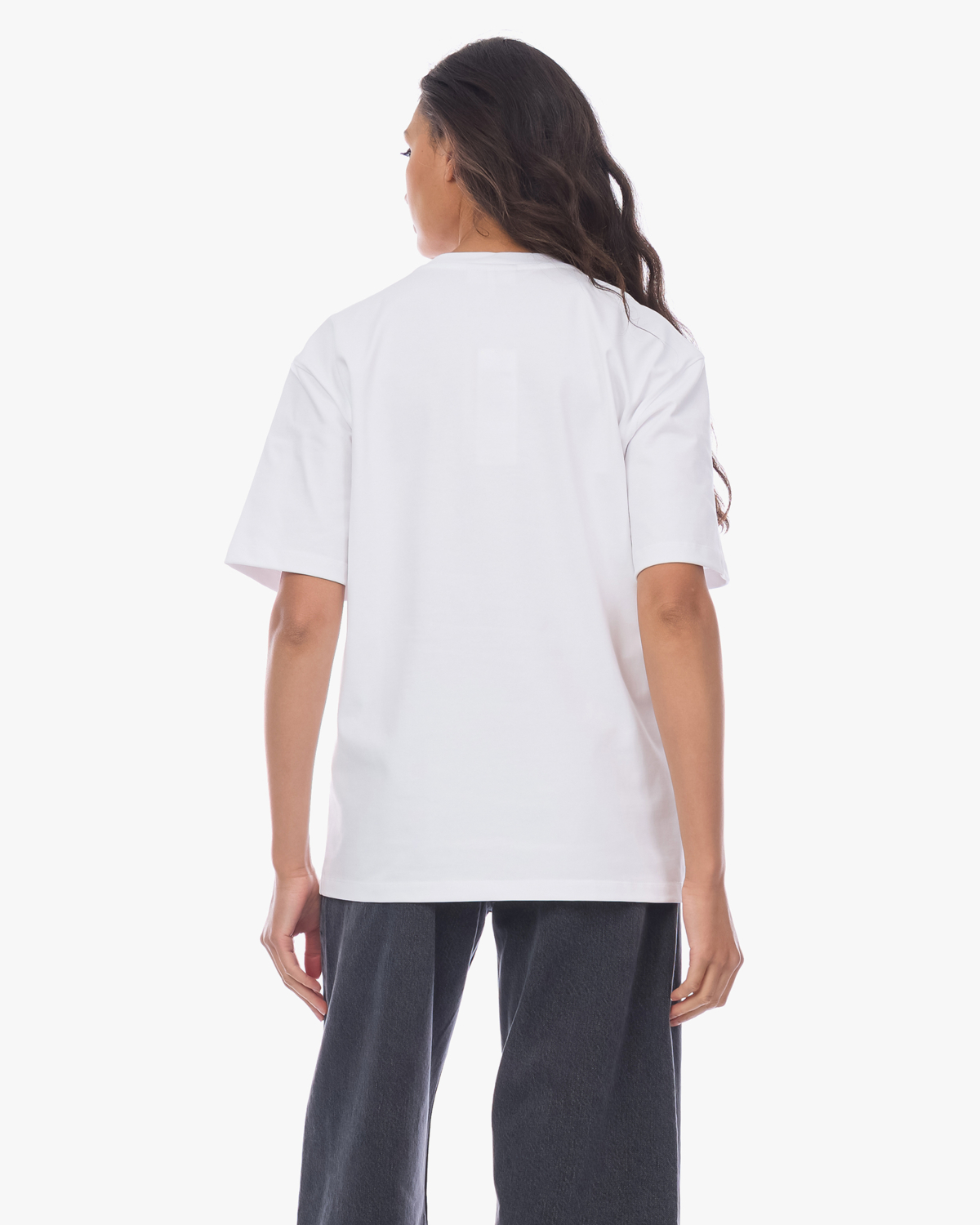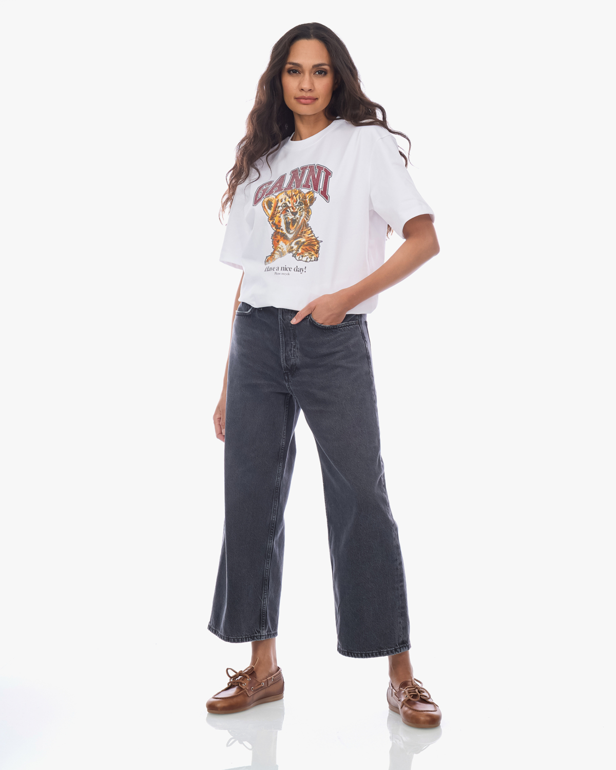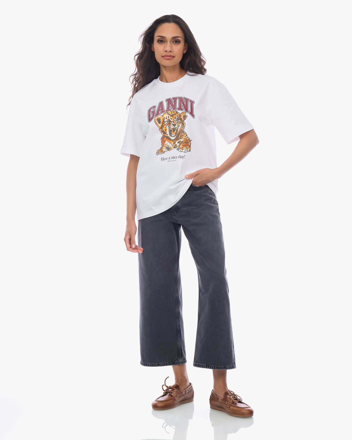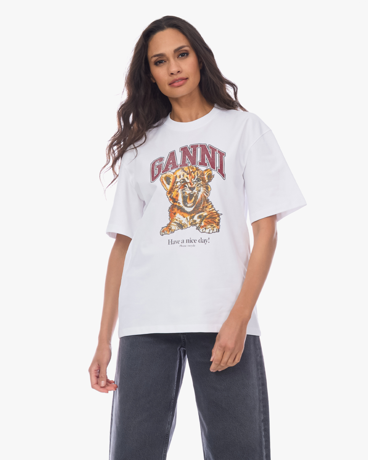 Deze witte graphic tee van Ganni toont een speelse tijgerprint met de tekst "GANNI" en "Have a nice day!". Het shirt is gemaakt van 100% katoen en heeft korte mouwen met een ronde halslijn. De regular fit zorgt voor een comfortabele pasvorm die niet te strak of te wijd valt. Het zachte katoen voelt prettig aan op de huid.