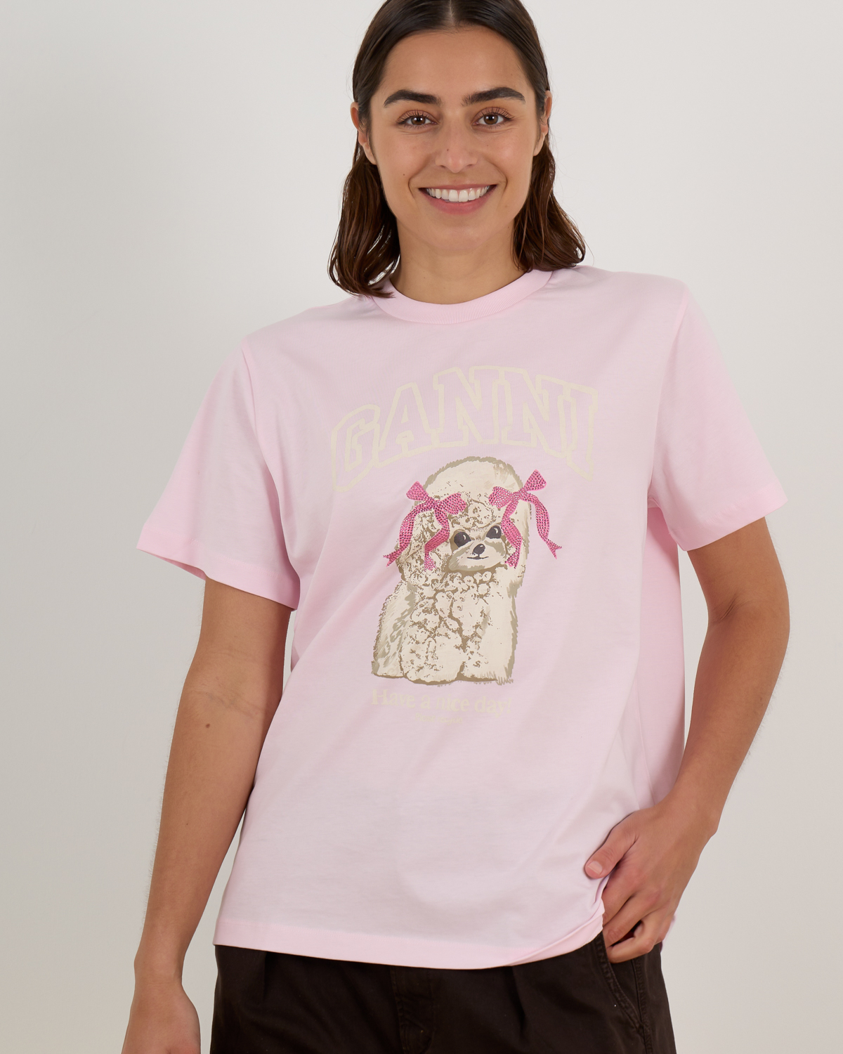 Dit roze t-shirt van Ganni combineer je mooi met een witte denim jacket en je favoriete jeans voor een relaxte dagelijkse look. Voor een zachte styling draag je het shirt met een beige linen broek en witte sneakers. Ook leuk onder een gebreid vest in neutrale tinten.