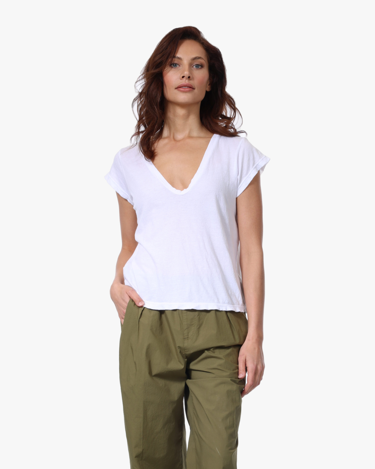 Combineer dit witte V-hals shirt met een linnen blazer en wijde broek voor een casual chique look, of draag het onder een denim jasje met een midi rok. Voor ontspannen dagen kun je het stijlen met cargo broeken en sneakers, terwijl het ook mooi staat onder een vest of cardigan.