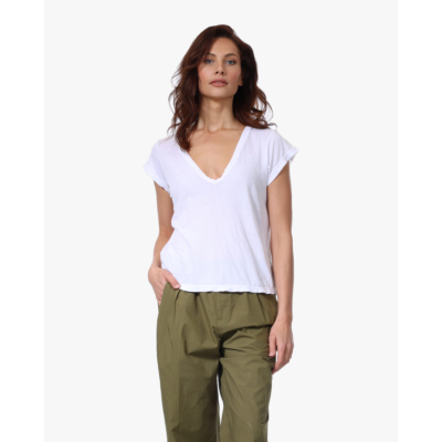 Dit witte t-shirt van James Perse heeft een diepe V-hals en korte mouwen met omgeslagen manchetten. Het shirt is gemaakt van 100% katoen en heeft een relaxed fit pasvorm die nonchalant draagt. De witte kleur en het gladde katoenen materiaal maken het een veelzijdige essential voor je garderobe. De losse snit valt comfortabel over je lichaam.