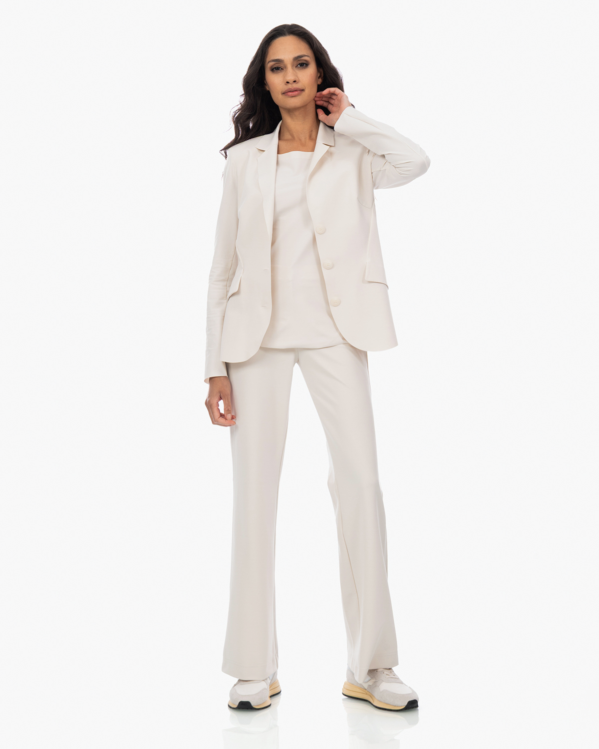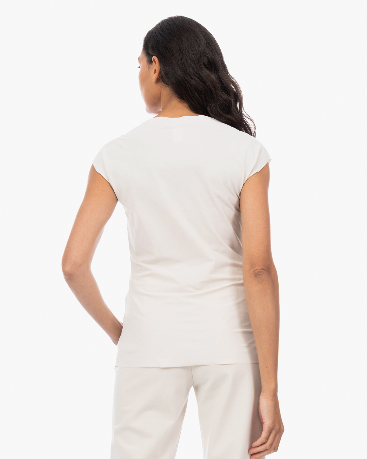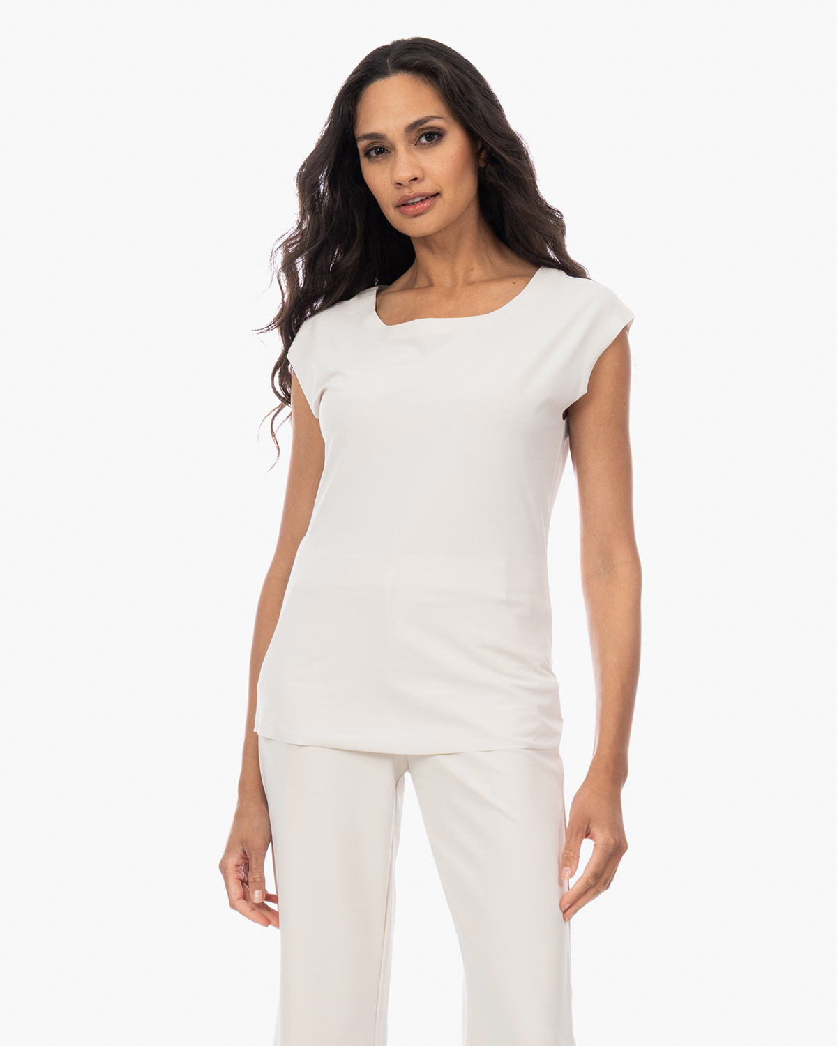 Combineer dit witte basisstuk met de bijpassende broek voor een complete look, of draag het onder een blazer voor een zakelijke outfit. Ook heerlijk onder een vest of cardigan voor gelaagde styling. Het neutrale wit maakt het shirt perfect om te matchen met gekleurde broeken of rokken.