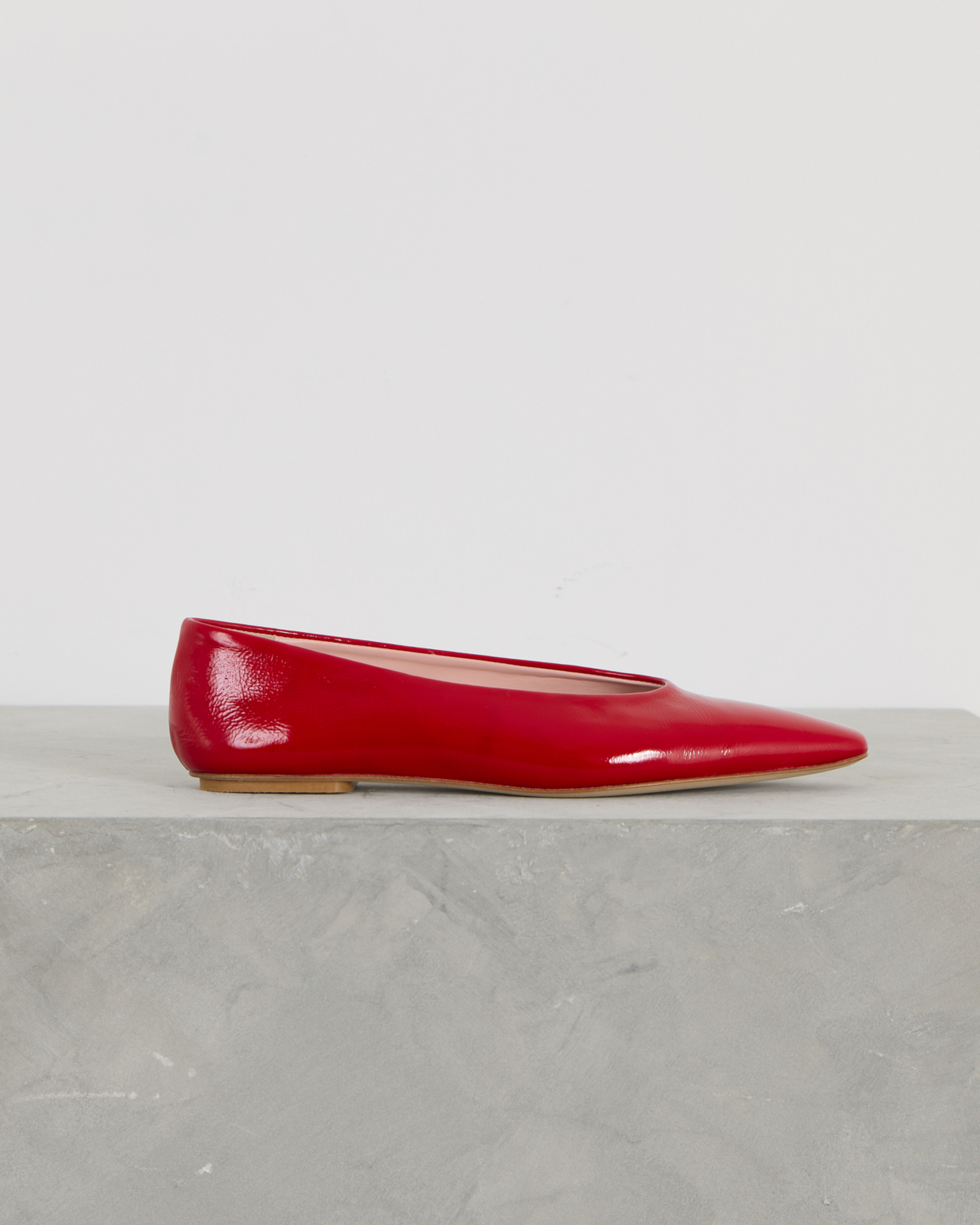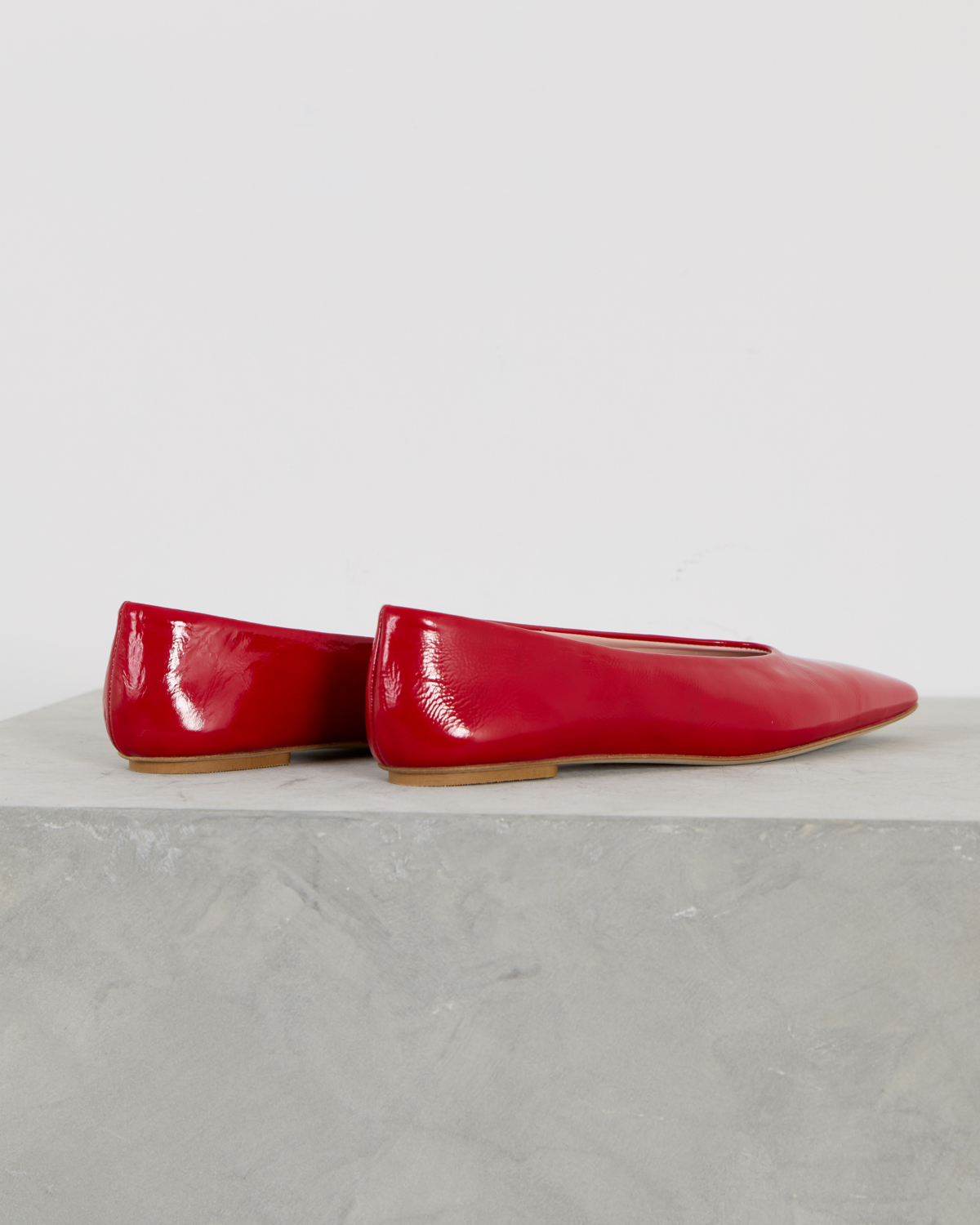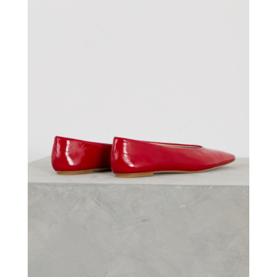 Deze ballerina's in rood zijn gemaakt van 100% leer met een opvallend glanzend lak finish. Het design heeft een spitse neus en een vlakke zool voor comfortabel dragen. De schoenen beschikken over een zachte leren voering in nude tinten en een lage hak voor extra stabiliteit.