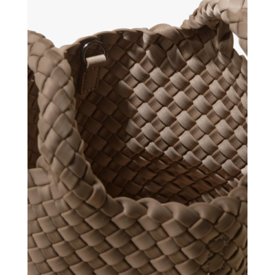 Deze compacte handtas van Naghedi heeft een opvallend geweven patroon dat volledig van neopreen is gemaakt. Het beige kleurenpalet geeft de tas een warme, neutrale uitstraling. De tas beschikt over gevlochten handvatten en een afneembare schouderband voor veelzijdig draagcomfort. Een ritssluiting houdt je spullen veilig, terwijl de compacte afmetingen perfect zijn voor de essentials.