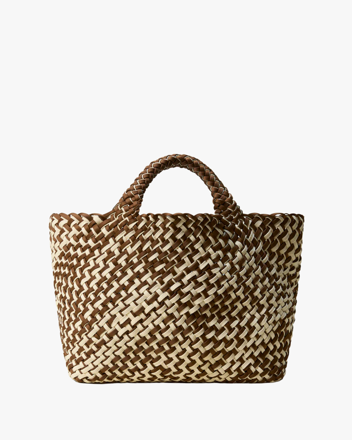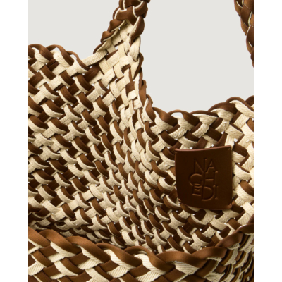 Deze gevlochten shopper van Naghedi combineert een bruine caramelkleur met crème in een opvallend double weave patroon. Gemaakt van neopreen, waardoor de tas lichtgewicht en flexibel aanvoelt. De stevige gevlochten hengsels zorgen voor extra comfort tijdens het dragen. Het ruime formaat biedt volop ruimte voor je dagelijkse benodigdheden.