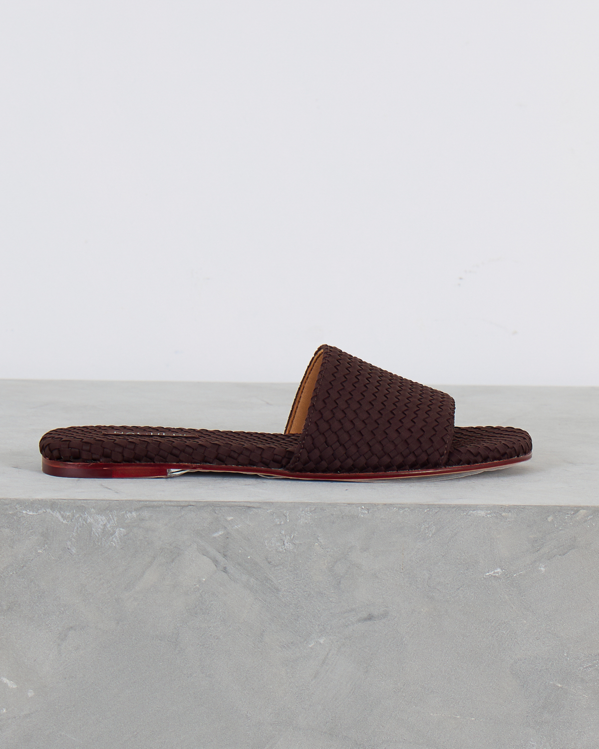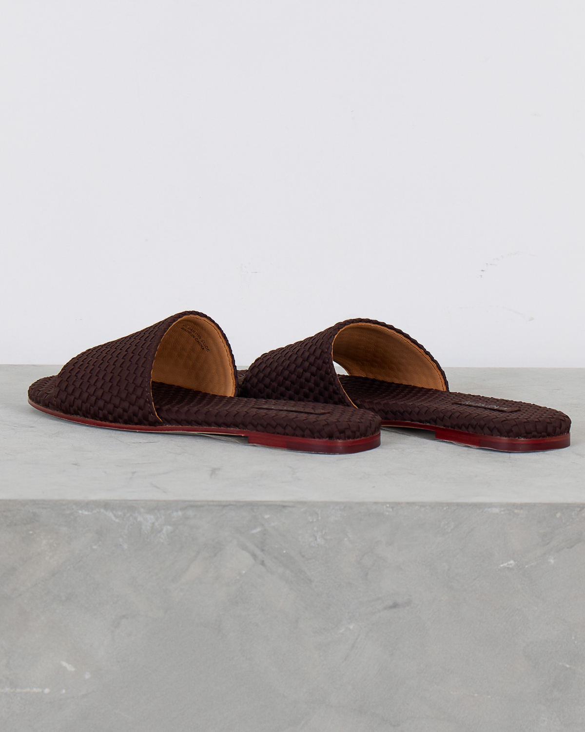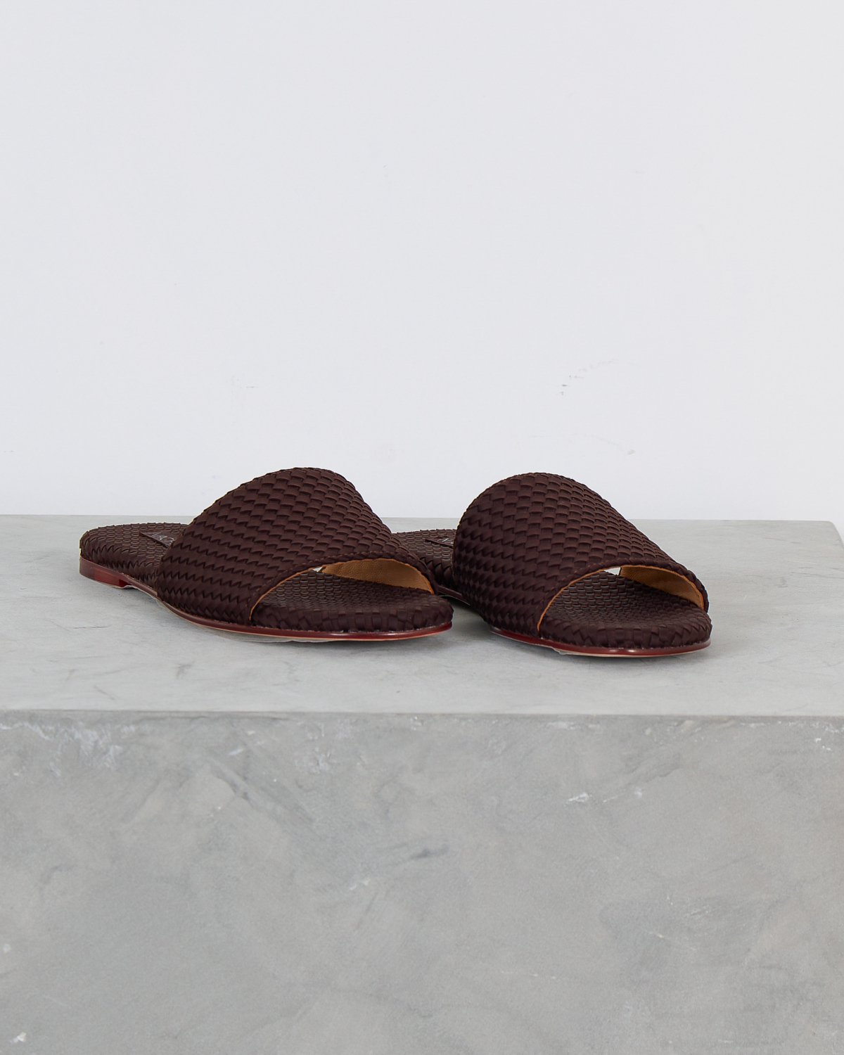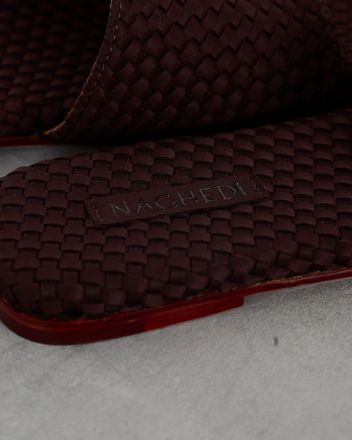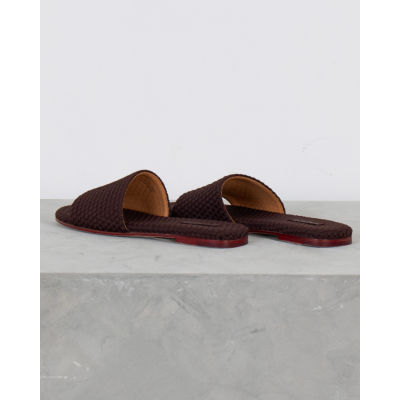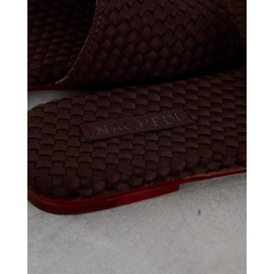 Deze chocoladebruine leren slides van Naghedi vallen op door het verfijnde gevlochten patroon. Het zachte leer heeft een gevlochten textuur die zowel de bandjes als de voetbedden bedekt. De platte zool toont een subtiele rode bies langs de rand, wat zorgt voor een stijlvol detail. De open constructie met brede bandjes biedt een comfortabele pasvorm.