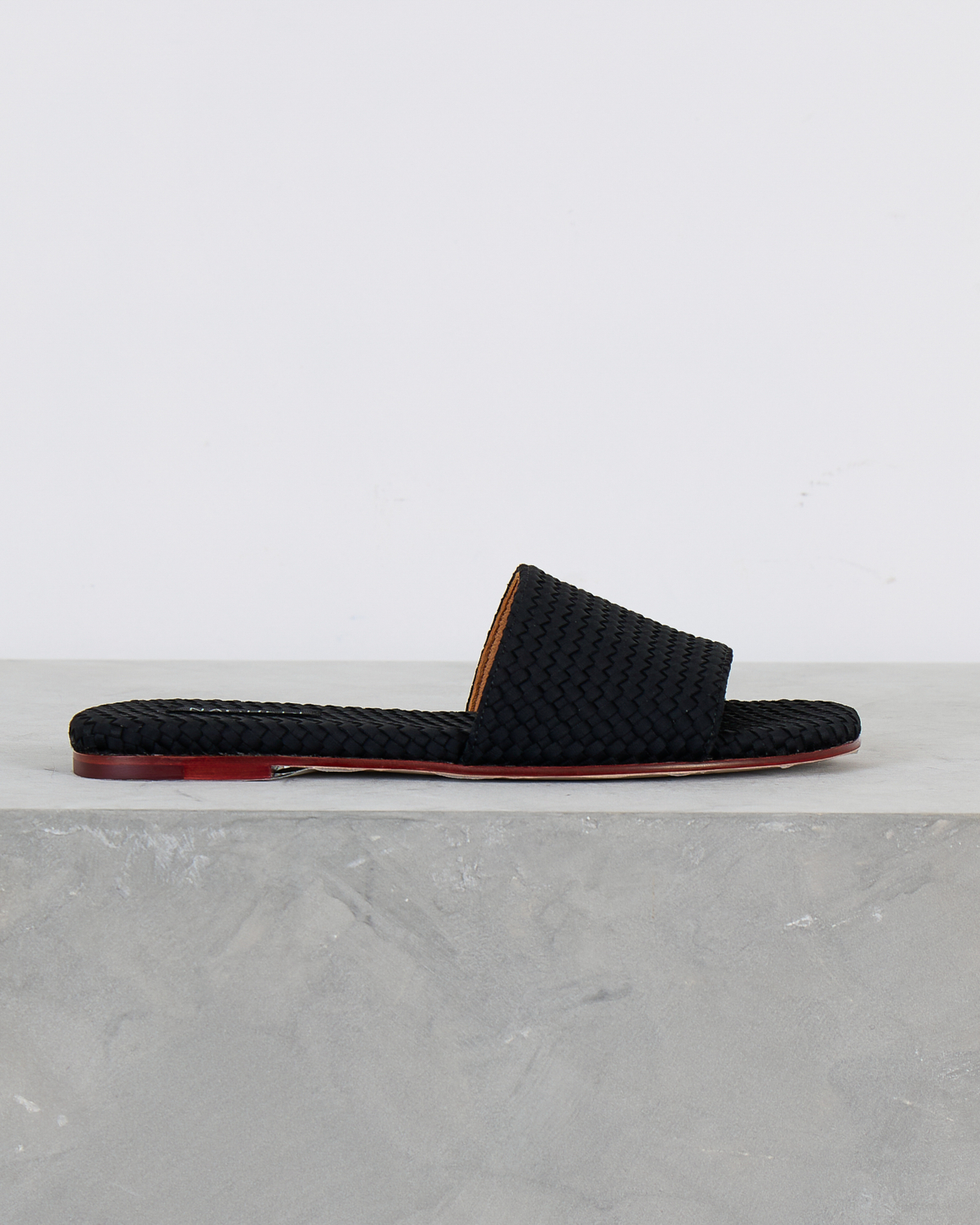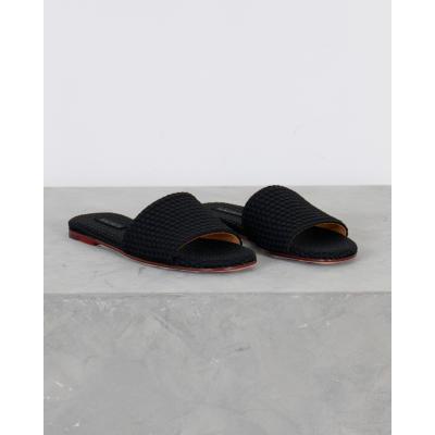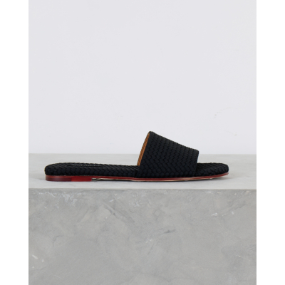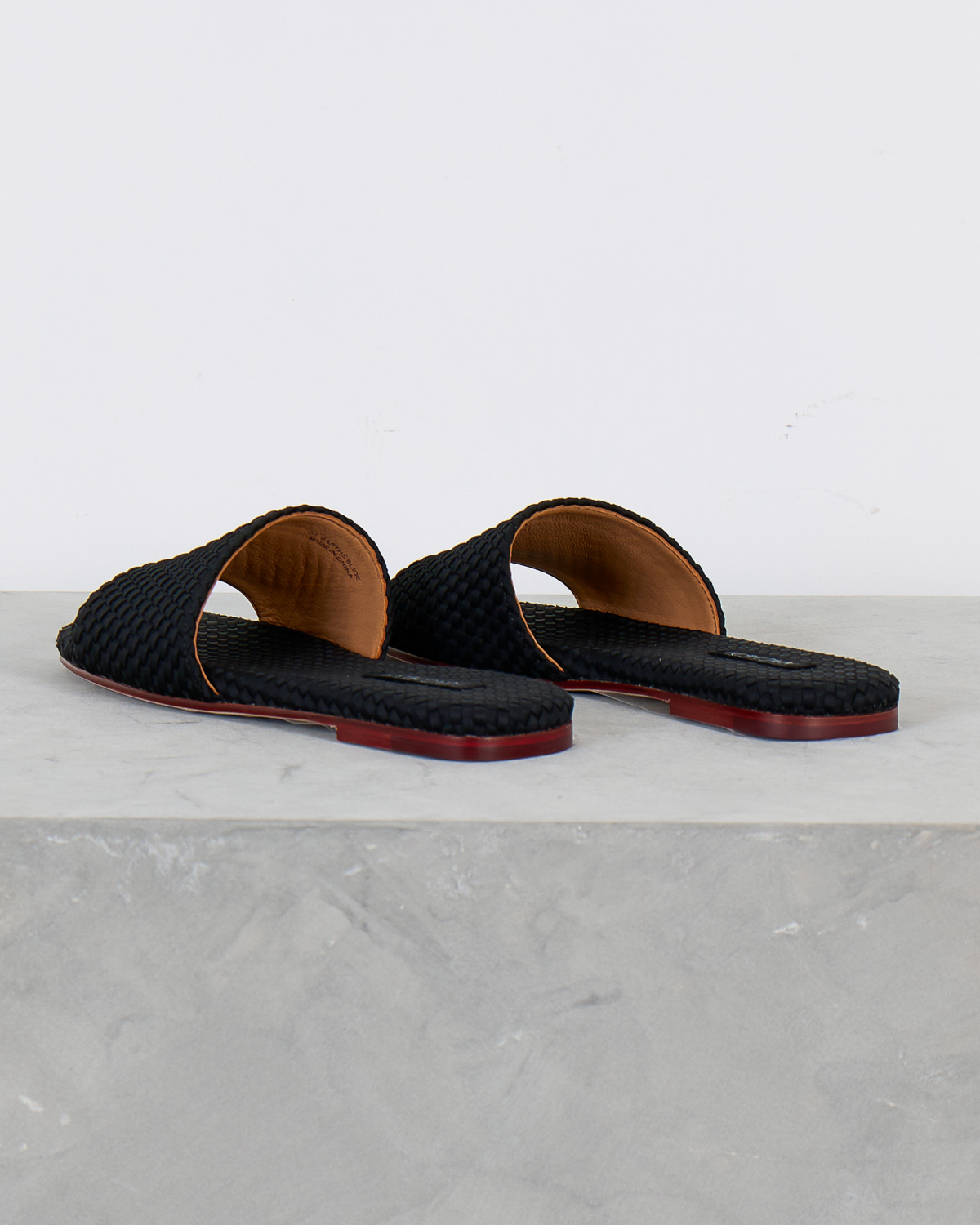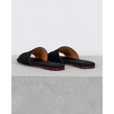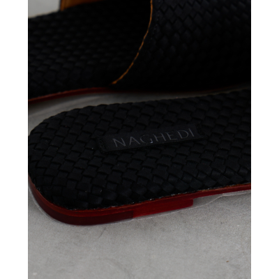Deze zwarte slide van Naghedi is vervaardigd uit gevlochten leer met een opvallende geweven textuur. De slip-on sandaal heeft een open teen en een platte zool met subtiele rode accenten aan de zijkant. Het leren voetbed biedt comfort en is afgewerkt met het merklabel. Een tijdloze zwarte kleur maakt deze slide veelzijdig te combineren.