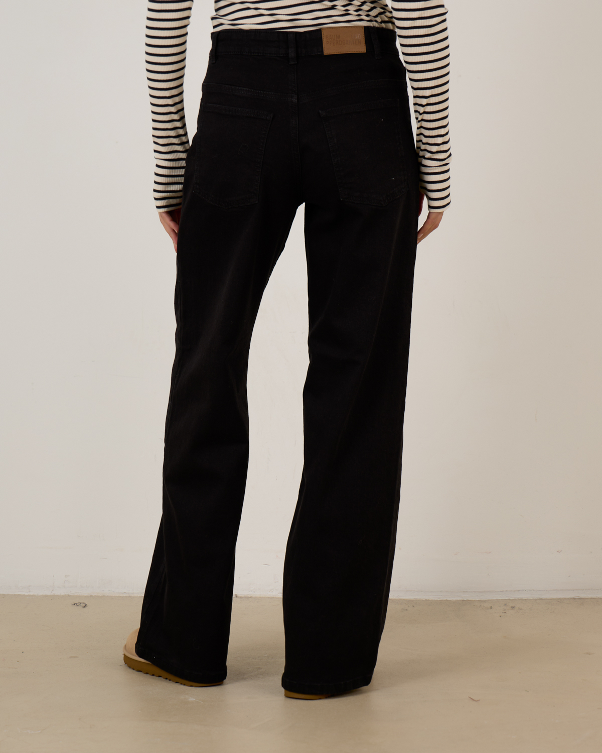 Deze zwarte jeans van Baum und Pferdgarten heeft een relaxed fit met rechte pijpen die wijd uitlopen. De broek is gemaakt van 98% katoen en 2% elastane, wat zorgt voor een comfortabele stretch. Het vijfzakkenmodel heeft een klassieke knoop- en ritssluiting, met het karakteristieke zilveren logo op de achterzak.