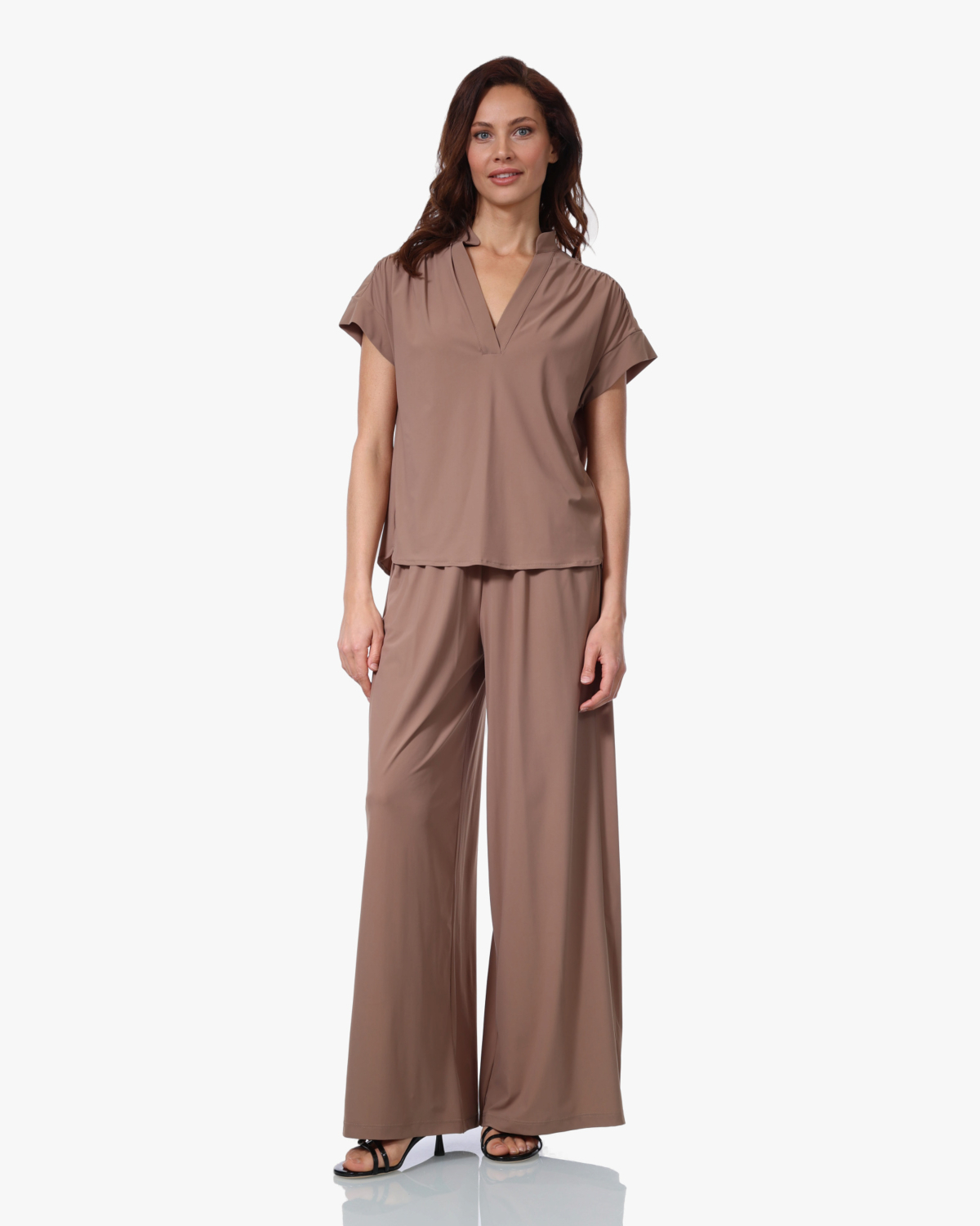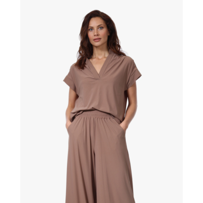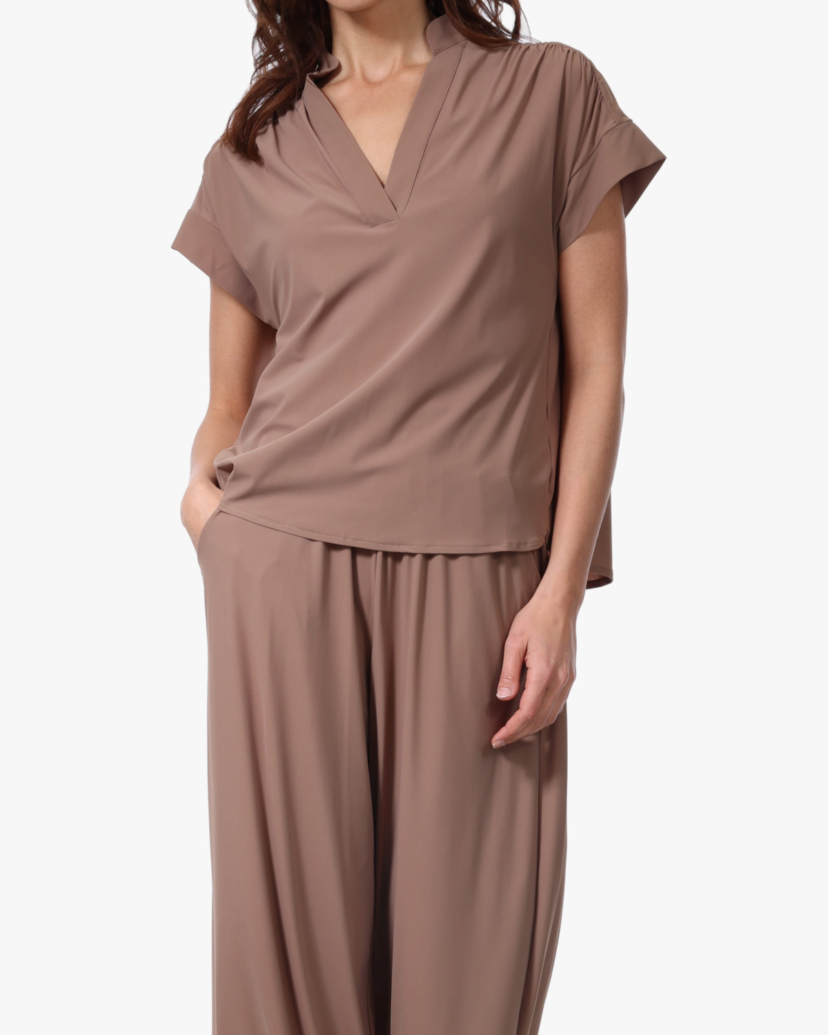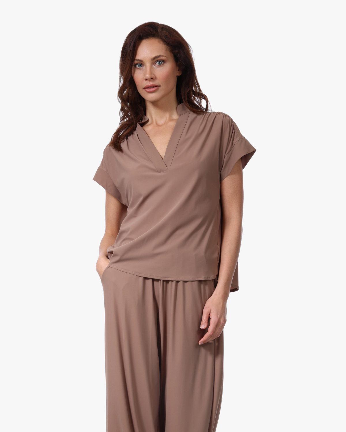 Combineer deze veelzijdige tech jersey blouse met een wijde pantalon voor een complete casual look, of draag hem bij een donkere broek voor contrast. Ook leuk over een lange rok of onder een blazer.