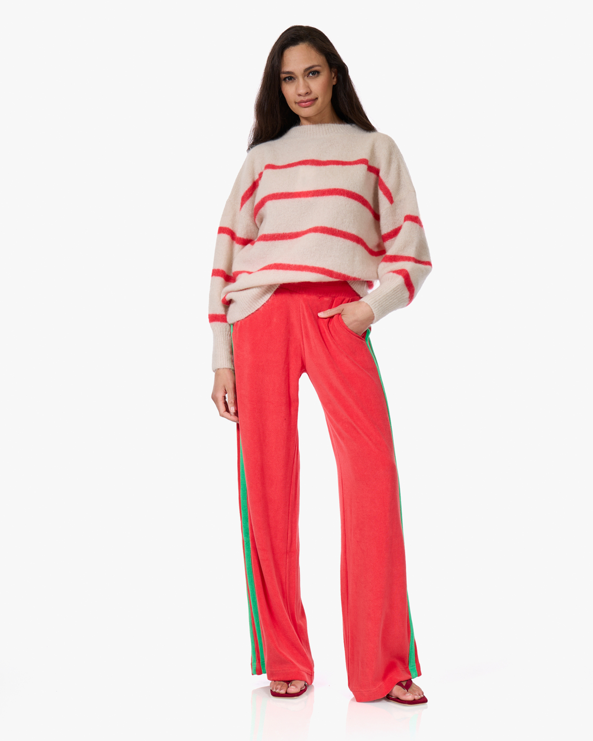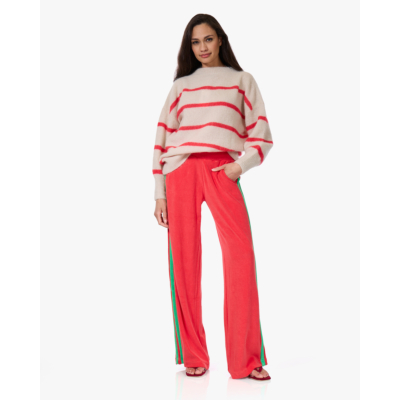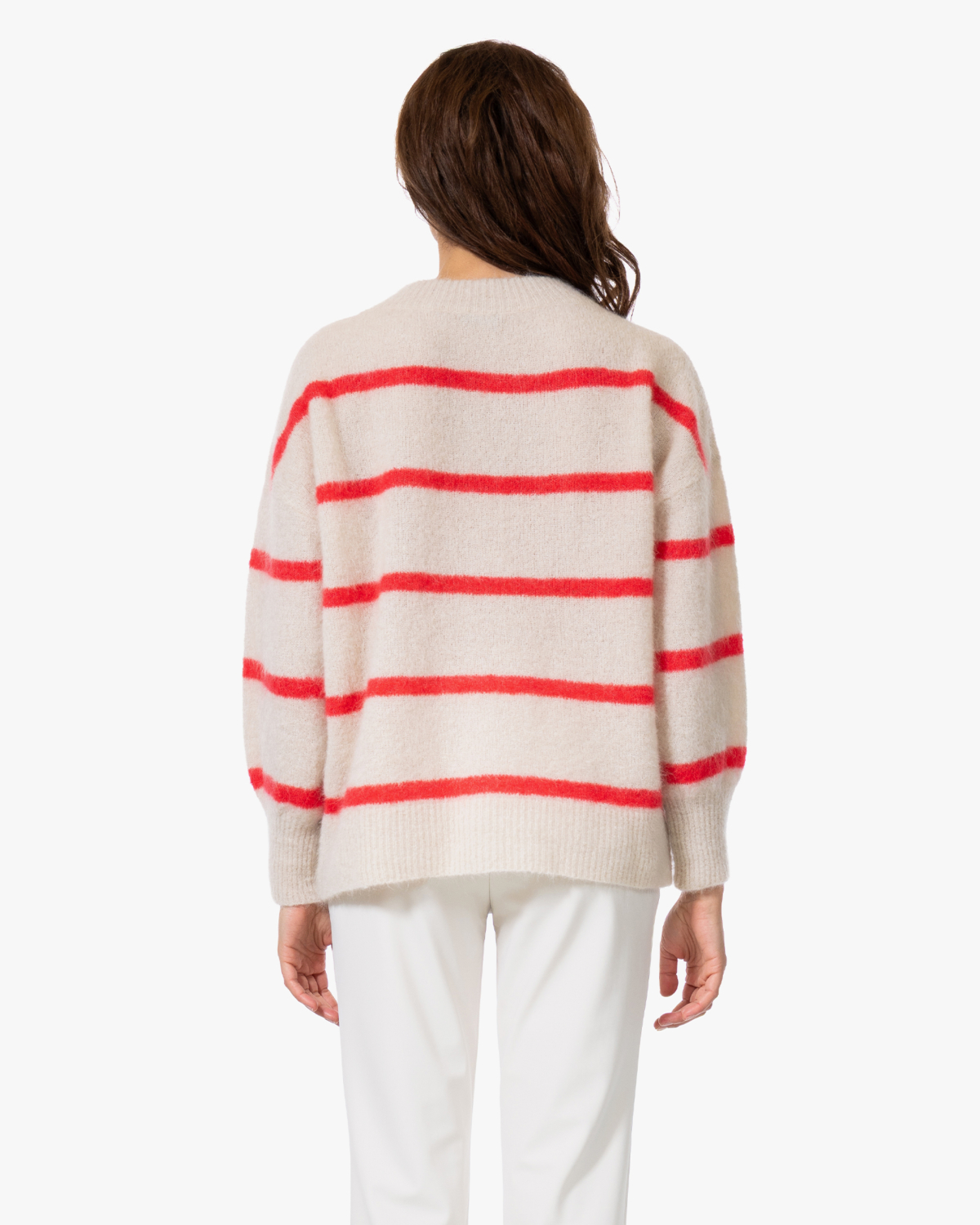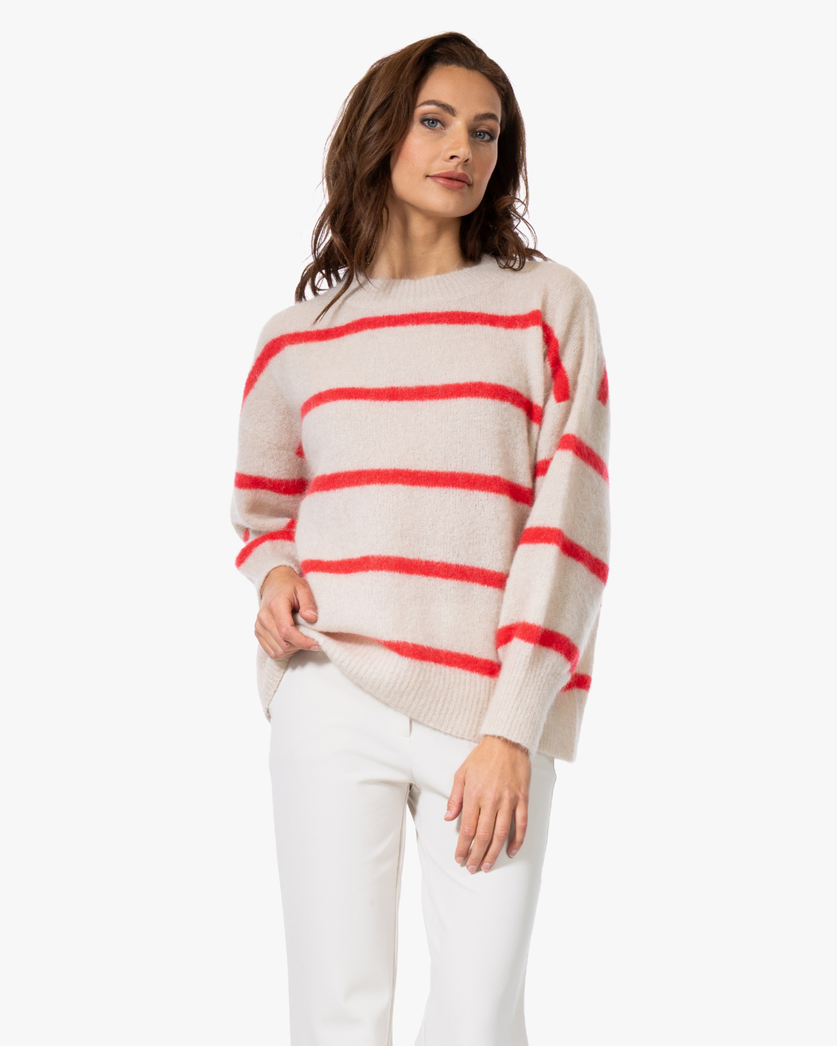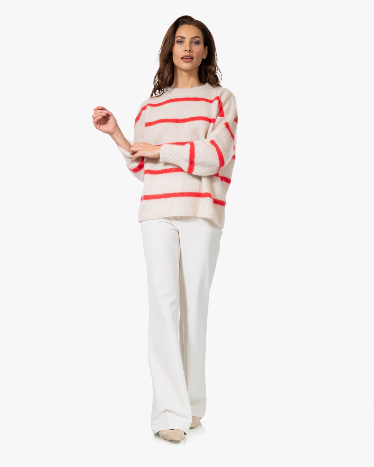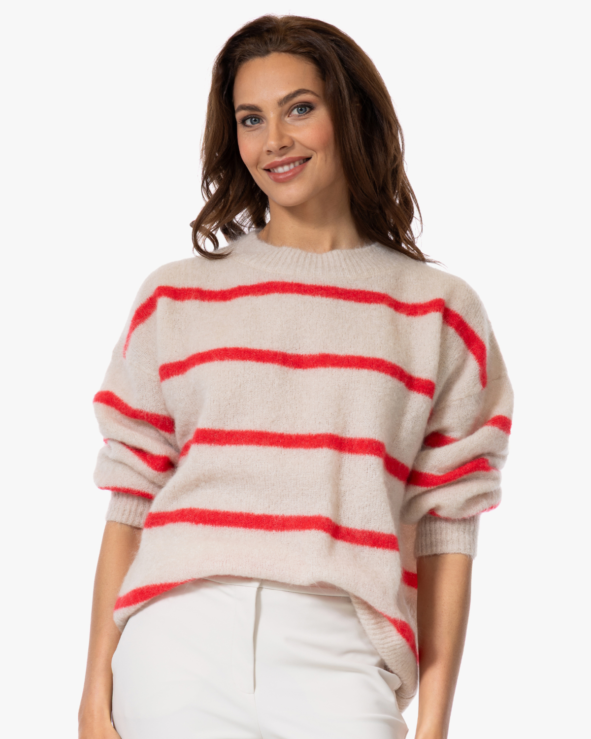 Deze gestreepte trui van no man's land combineert zacht beige met opvallende rode strepen voor een speelse twist. De trui heeft een relaxed fit met lange mouwen en ronde halsuitsnijding. Gemaakt van een luxe mohair-wolmix (38% mohair, 38% wol, 19% polyamide, 5% elastaan) die heerlijk zacht aanvoelt en comfortabel draagt.