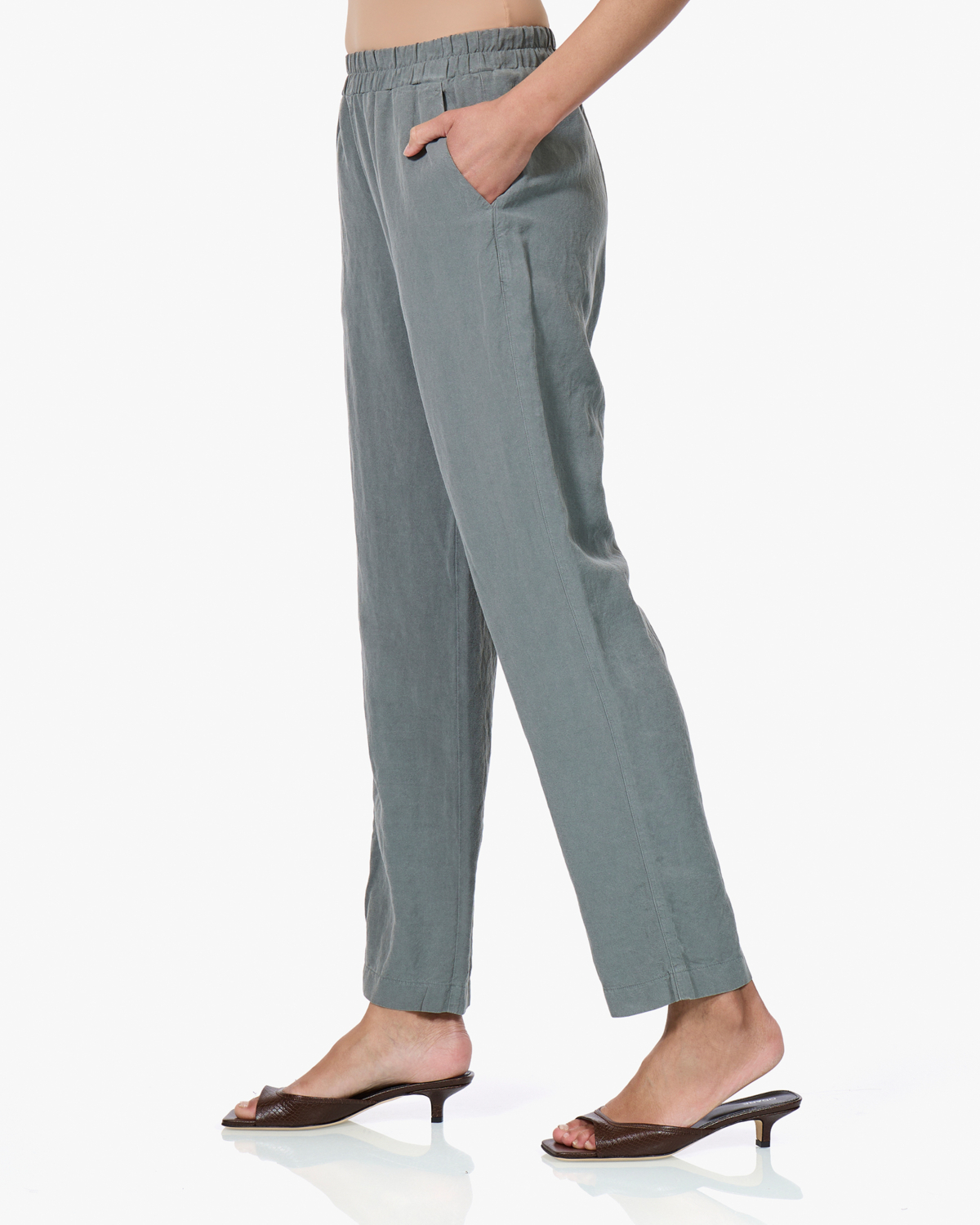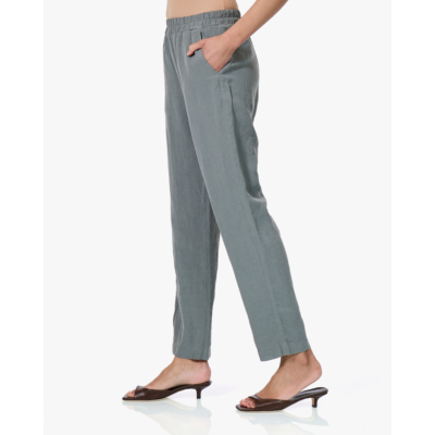 Deze groene linnen broek in een zachte sage tint is gemaakt van een comfortabele mix van 71% Tencel en 29% linnen. De broek heeft een relaxed straight-leg silhouet met elastische tailleband voor optimaal draagcomfort. Praktische steekzakken aan de voorkant zorgen voor functionaliteit, terwijl de enkellange pijpen een moderne, nonchalante uitstraling geven.