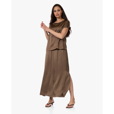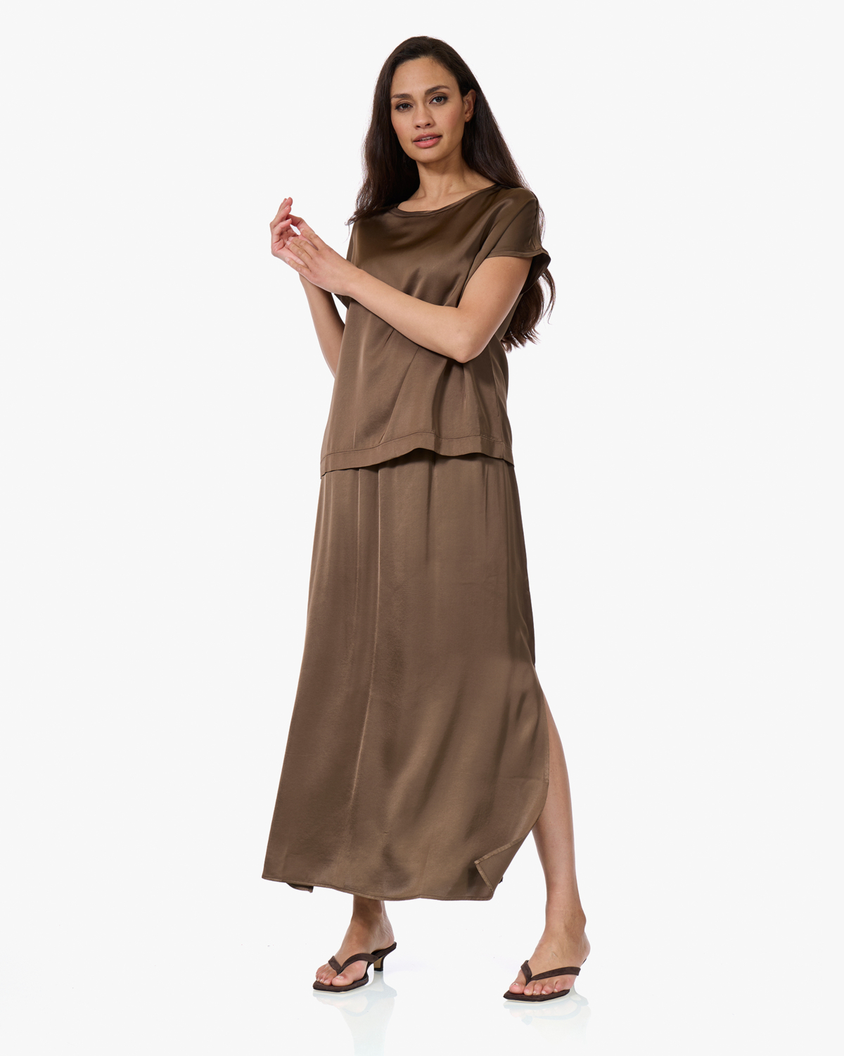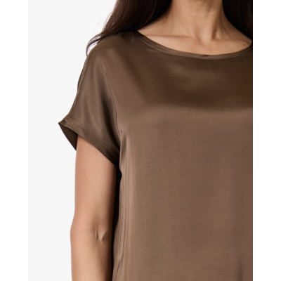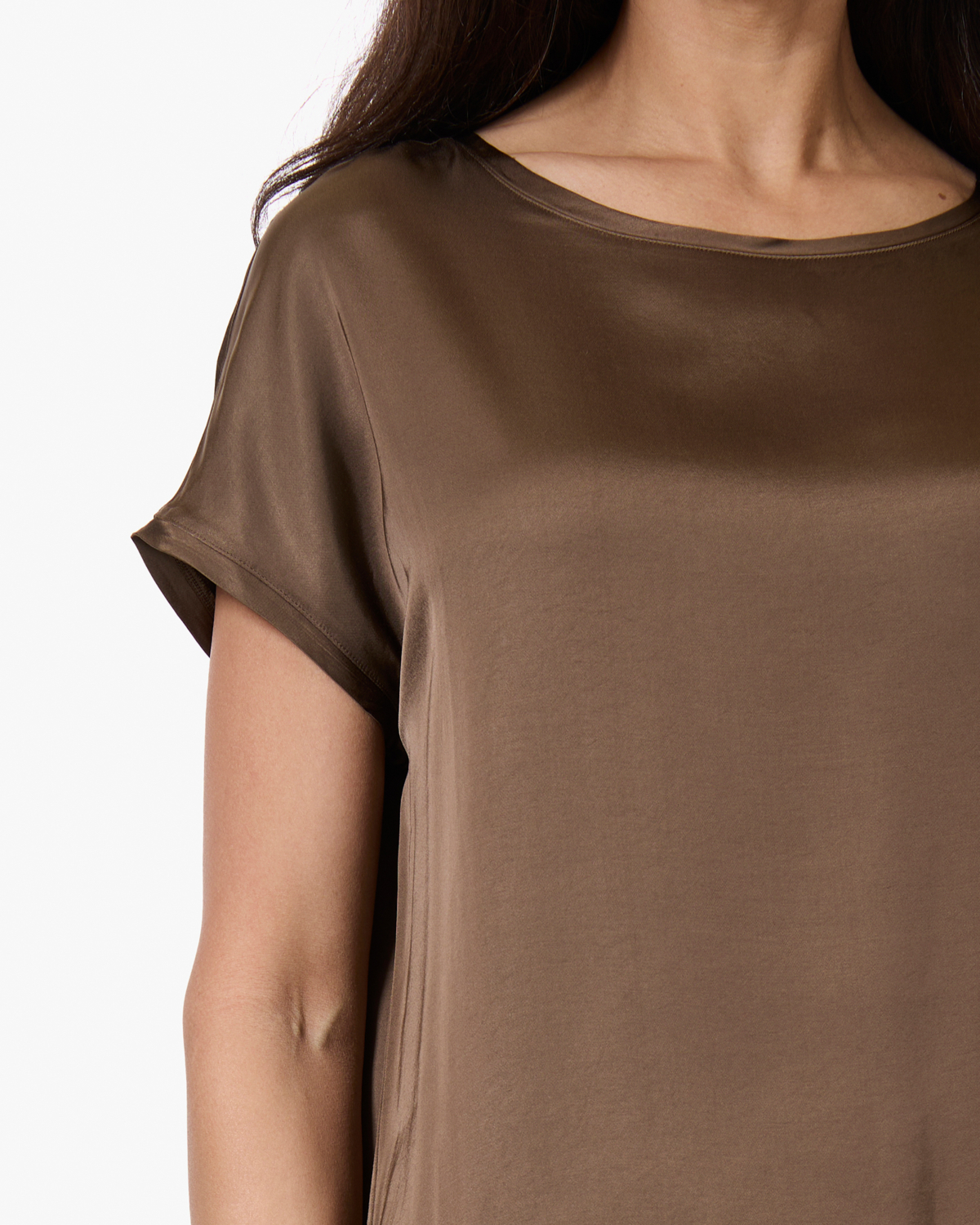 Deze satijnen top in een warme bruintintint heeft een relaxed-fit silhouet met korte mouwen en een ronde hals. Het 100% viscose materiaal voelt zacht aan en valt luchtig om je lichaam. De top heeft opgenaaide mouwuiteinden en een afgewerkte zoom voor extra detail. Perfect voor laagjes looks of solo gedragen voor een nonchalante uitstraling.