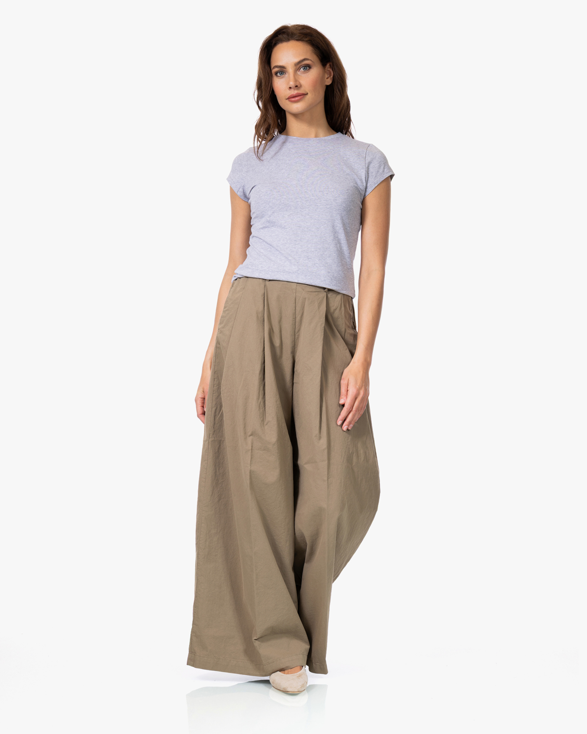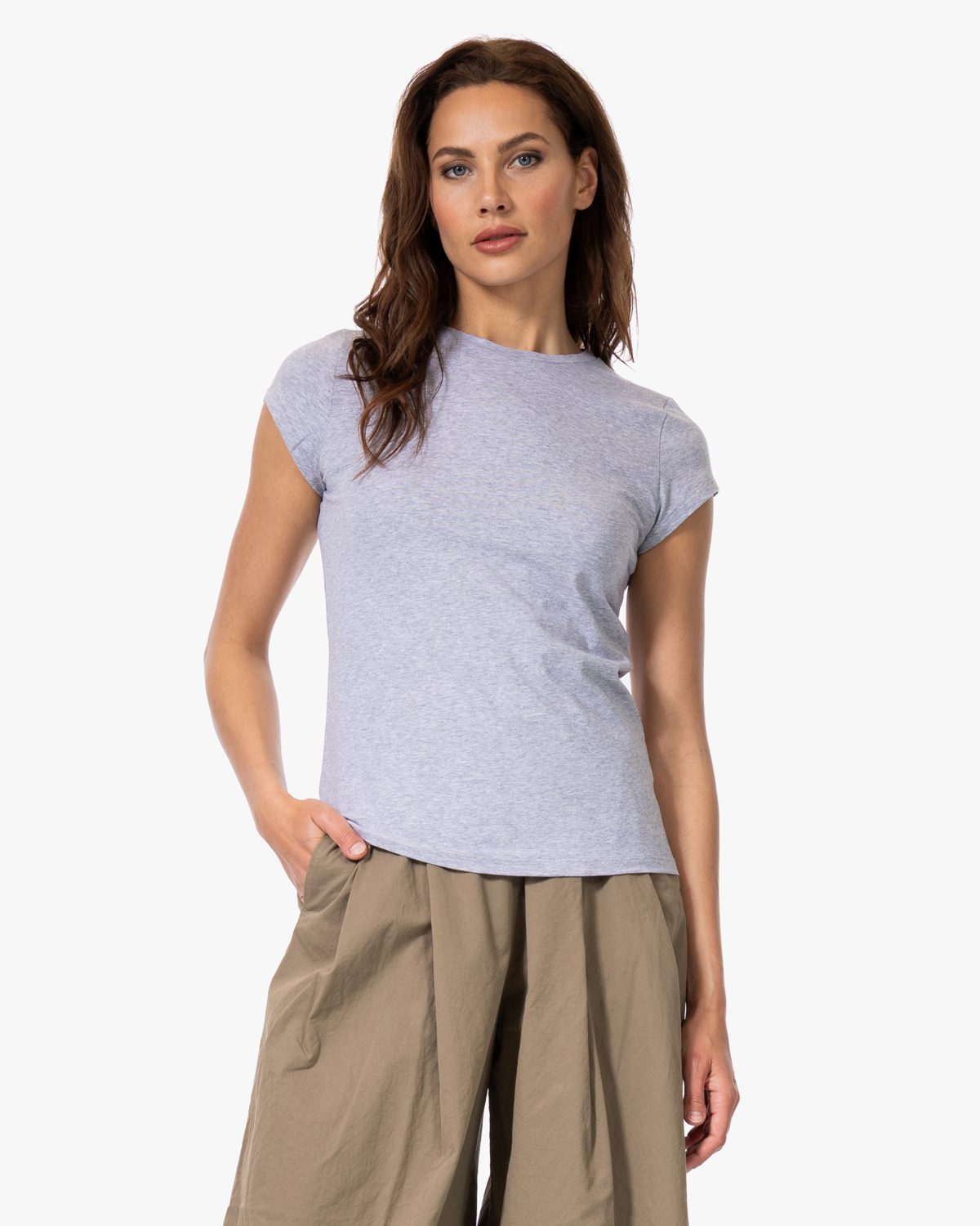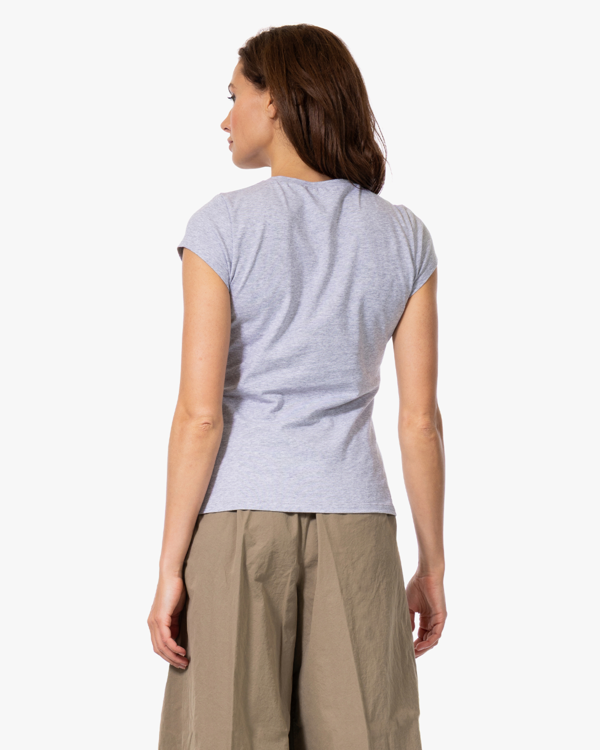 Dit dames t-shirt combineert je gemakkelijk met wijde broeken, zoals de beige katoenen culotte op de foto, voor een relaxte look. Ook leuk onder een open blazer of vest, of gestyled met een denim rok en sneakers. De neutrale grijze tint past bij bijna elke kleur en maakt het een veelzijdige basis voor verschillende outfits.
