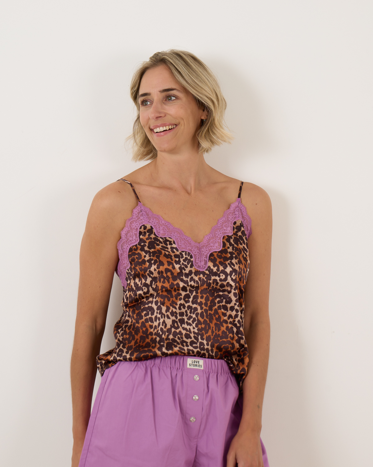 De Pip top in leopard print heeft een verfijnde, losse pasvorm die soepel om het lichaam valt. De zachte V-hals benadrukt de vrouwelijke uitstraling, terwijl subtiele paarse details zorgen voor een speelse twist. Dankzij de verstelbare schouderbandjes aan de achterkant sluit de top altijd mooi aan.