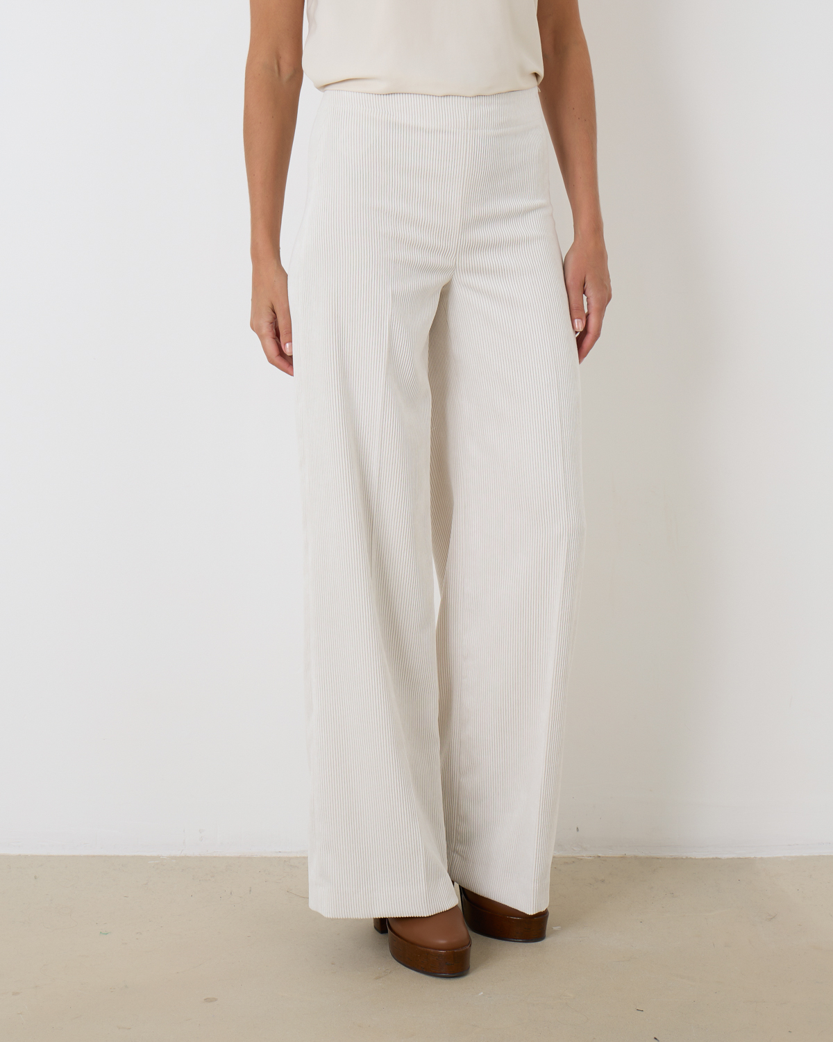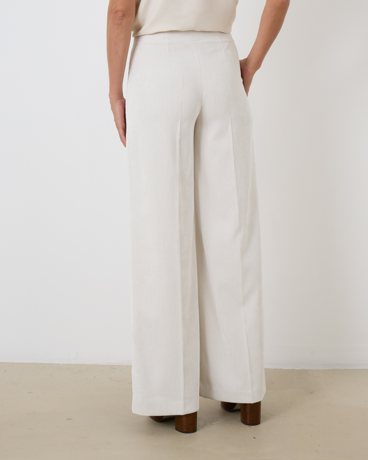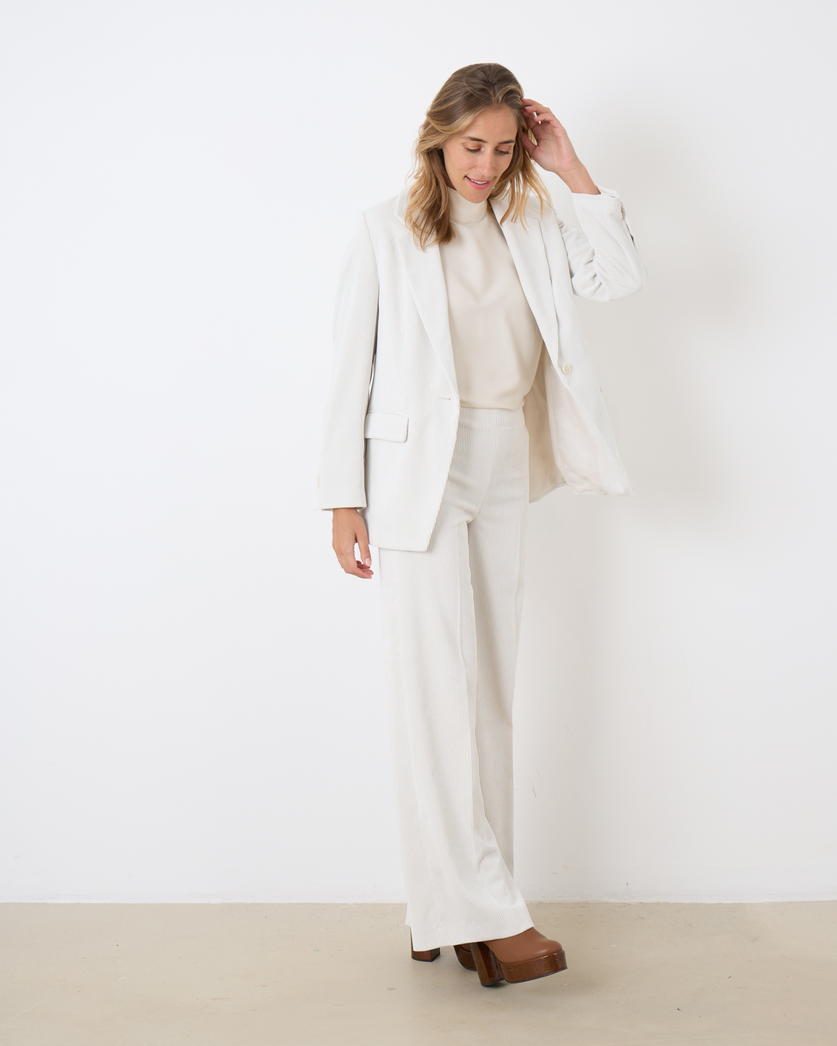 Deze geribbelde pantalon in off white van Drykorn heeft een tijdloze straight fit die heerlijk comfortabel zit. Het verticale ribpatroon geeft textuur en visual interest, terwijl de soepele samenstelling van 90% polyester, 8% polyamide en 2% elastaan zorgt voor bewegingsvrijheid. De pantalon heeft een elegante wijde pijp en een rits aan de zijkant voor een strakke afwerking.
