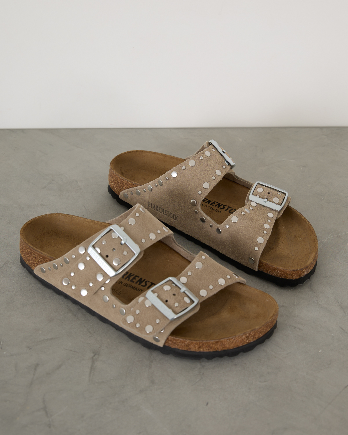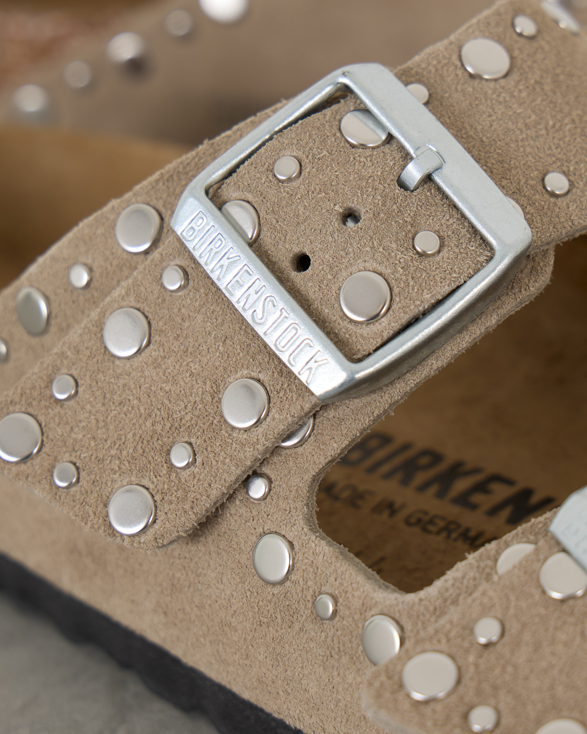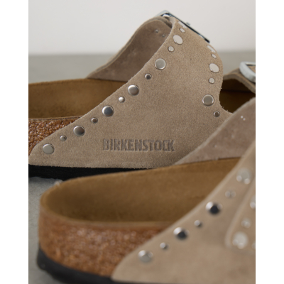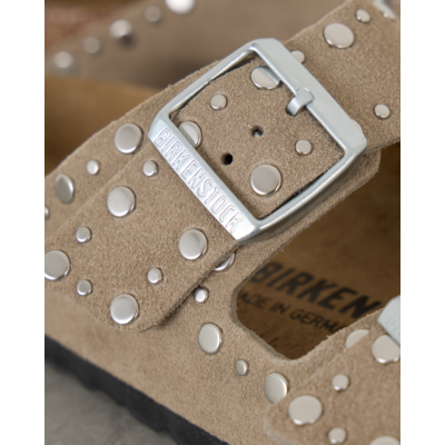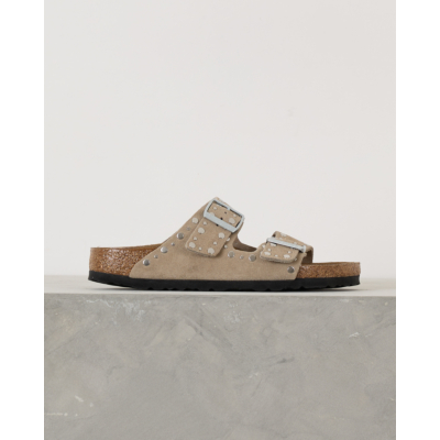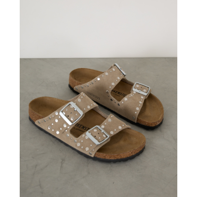 Deze stoere sandalen van Birkenstock hebben een speelse twist met metallic studs in verschillende formaten. Het zachte beige suède voetbed biedt de bekende Arizona pasvorm met twee verstelbare banden en metalen gespen. De kurk middenzool zorgt voor comfort en de zwarte rubberen buitenzool voor grip.
