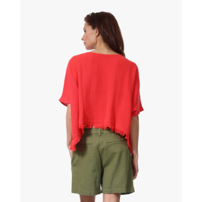 Deze rode top van Lanai valt op door de speelse franjes aan de onderzijde. De top heeft korte mouwen en een ronde hals, gemaakt van 100% katoen voor heerlijk draagcomfort. De relaxte pasvorm geeft je bewegingsvrijheid, terwijl de vrolijke rode kleur direct je favoriete zomerlook compleet maakt. Het katoenen materiaal voelt zacht aan en is praktisch in onderhoud.