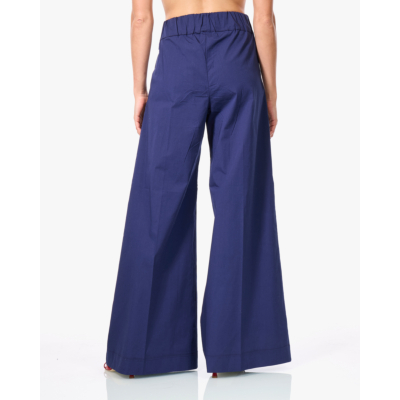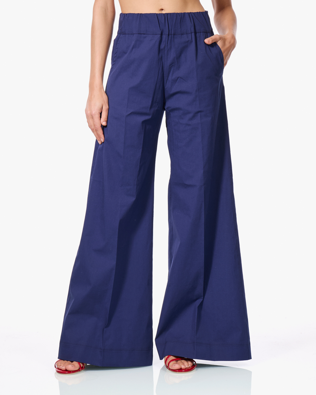 Deze stijlvolle donkerblauwe broek van poplin katoen valt heerlijk wijd door de losse pasvorm en wijde pijpen. Het zachte materiaal van 97% katoen en 3% elastaan zorgt voor bewegingsvrijheid en comfort. De broek heeft een elastische tailleBand en praktische zijzakken. Het tijdloze ontwerp biedt nonchalante elegance voor elke dag.
