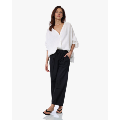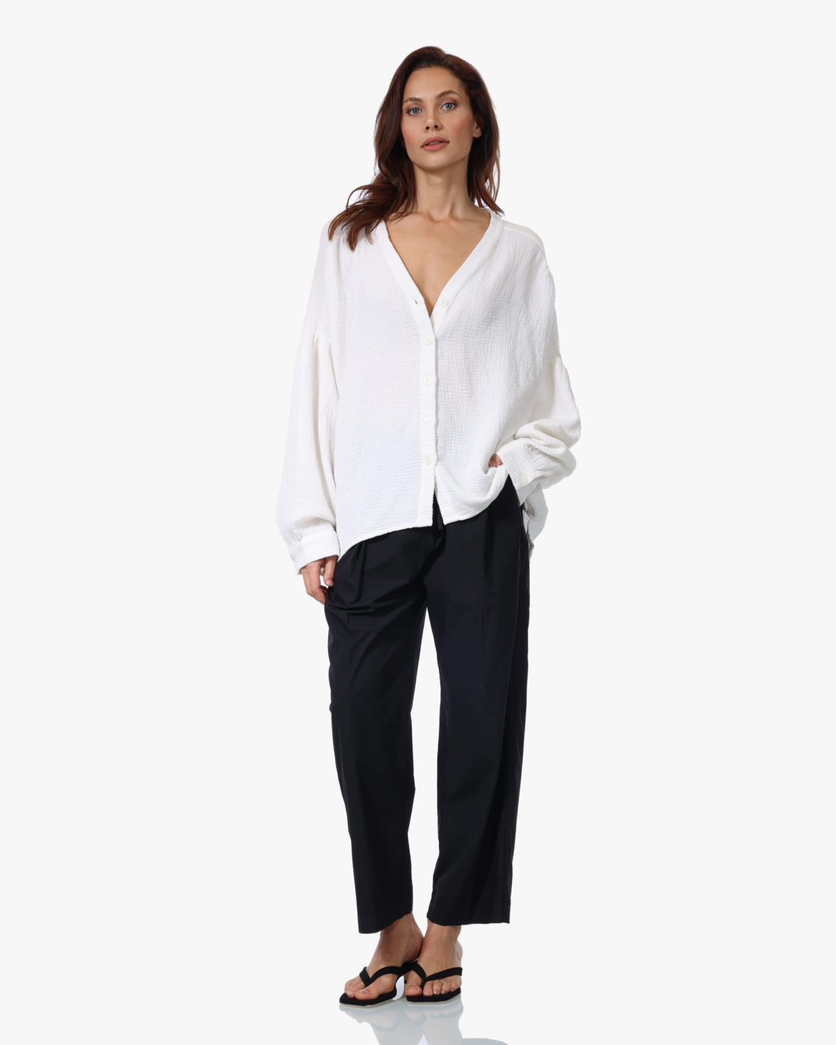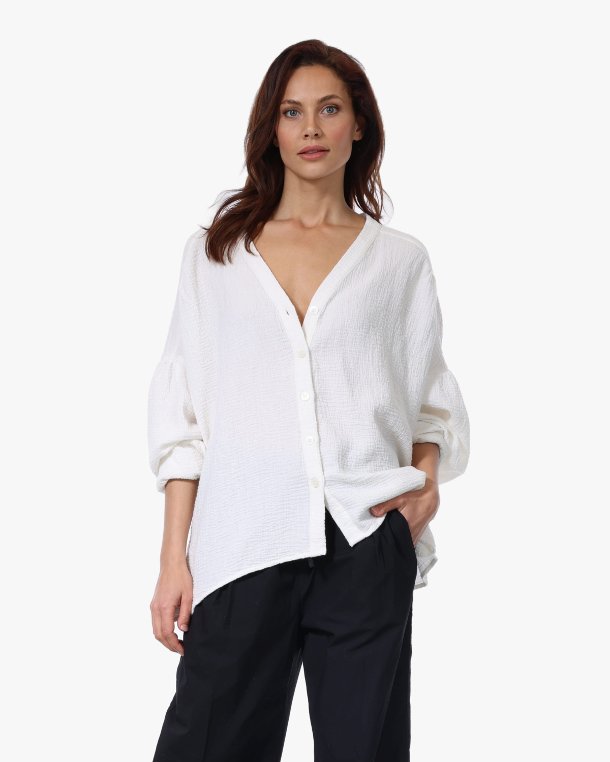 Deze relaxte blouse straalt nonchalante elegantie uit in een zachte off white tint. Gemaakt van 100% katoen met een luchtige gekreukte textuur die heerlijk aanvoelt. De oversized pasvorm biedt volop bewegingsvrijheid, terwijl de diepe V-hals en knoopsluiting aan de voorzijde een vrouwelijke touch geven. De lange mouwen zorgen voor veelzijdigheid in je styling.