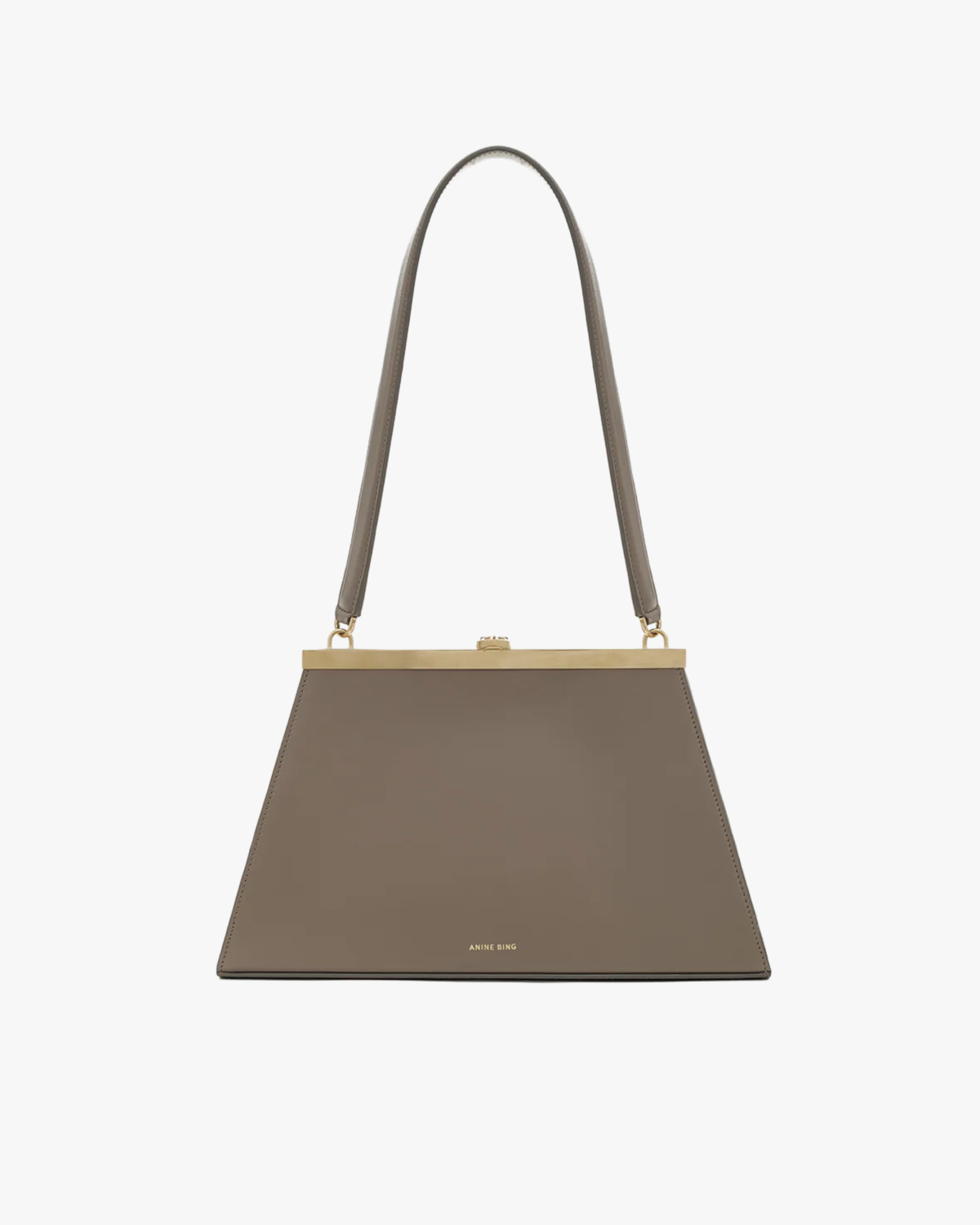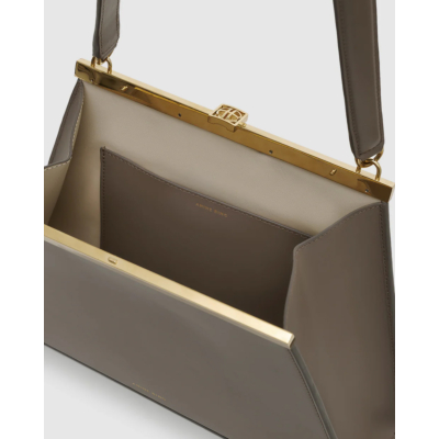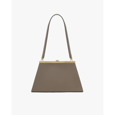 Deze elegante leren handtas in beige heeft een unieke trapezevormige silhouet met een markant goudkleurig frame aan de bovenkant. Het gladde leer voelt stevig aan en de handtas sluit met een klikbeslag. De verstelbare hengsels zijn afgewerkt met goudkleurige hardware. Aan de binnenkant vind je een ruim compartiment met een lichtbeige voering.