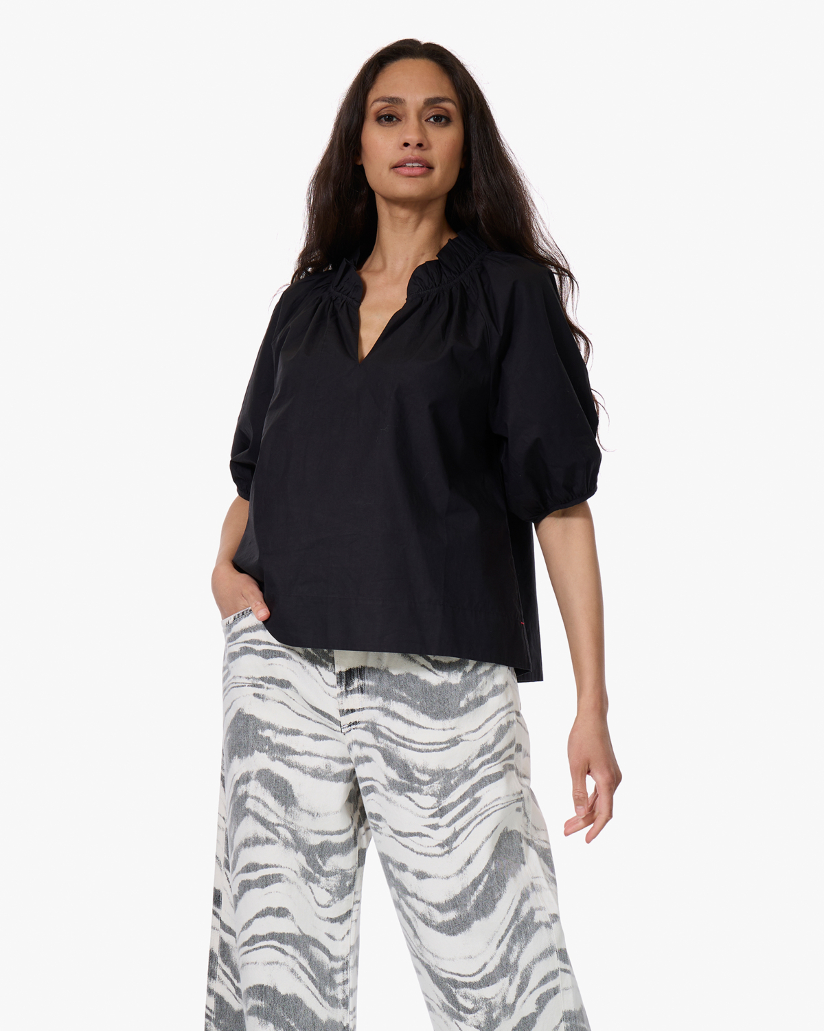 Deze zwarte blouse van 100% katoen heeft een relaxed fit silhouet met elastische ruffels rond de halslijn. De driekwart pofmouwen zijn afgewerkt met elastische boordjes en de V-hals geeft een vrouwelijke touch. Het zachte katoenen materiaal zorgt voor heerlijk draagcomfort en de losse pasvorm maakt dit een ideale blouse voor dagelijks gebruik.