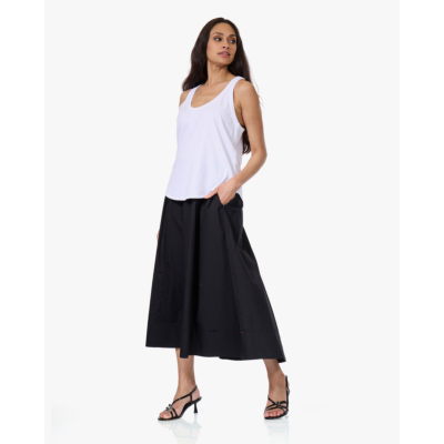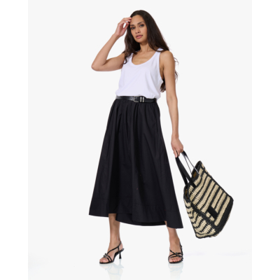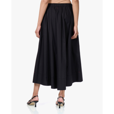 Deze zwarte poplin rok van Xírena heeft een tijdloze A-lijn silhouet dat tot de enkels valt. Gemaakt van 100% katoen, voelt de rok luchtig aan door de fijne poplin weving. De elastische tailleband met trekkoord zorgt voor een comfortabele pasvorm. Praktische zijzakken maken het design compleet. De discrete rode details aan het koord voegen een speels accent toe aan deze elegante essential.